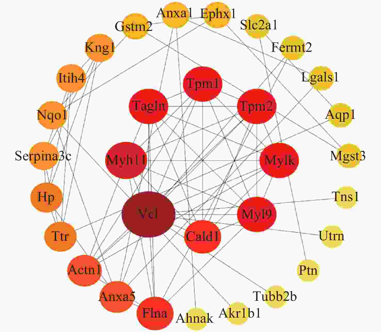 Rank Name Score 1 VCL 14 2 MYH11 9 3 MYL9 8 3 TAGLN 8 3 MYLK 8 3 TPM2 8 3 TPM1 8 8 CALD1 7 8 FLNA 7 10 ANXA5 6 表 2 最重要模块的蛋白组成(中子辐射)