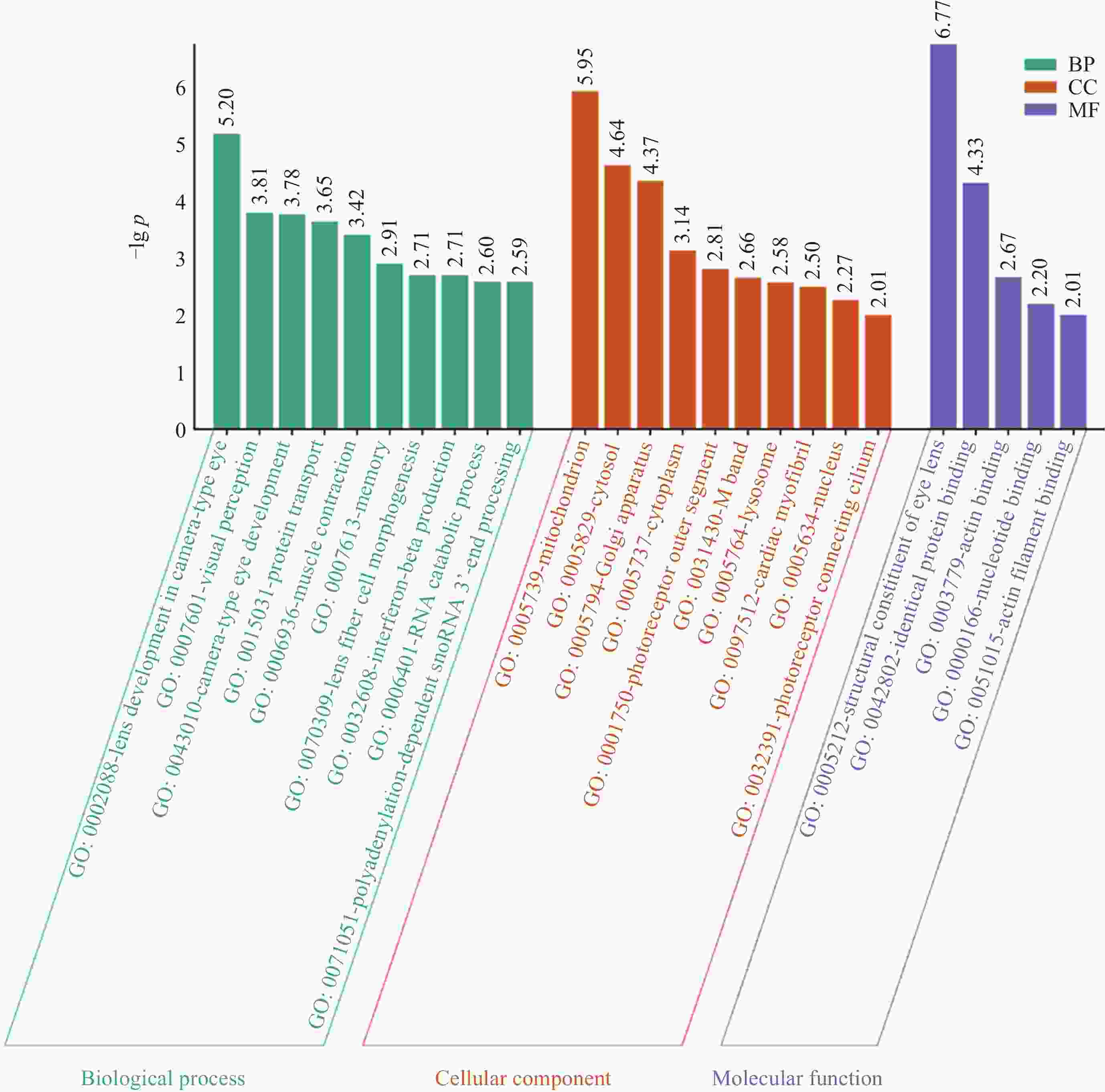 GO-ID p-value Description Genes in test set 43010 9.94×10–10 Camera-type eye development CRYGB, CRYBA1, CRYBB2, CRYAA, CRYAB 1654 2.54×10–9 Eye development CRYGB, CRYBA1, CRYBB2, CRYAA, CRYAB 7423 3.05×10–8 Sensory organ development CRYGB, CRYBA1, CRYBB2, CRYAA, CRYAB 2088 3.15×10–7 Lens development in camera-type eye CRYGB, CRYAA, CRYAB 60561 3.93×10–7 Apoptosis involved in morphogenesis CRYAA, CRYAB 70307 3.93×10–7 Lens fiber cell development CRYGB, CRYAA 70309 3.93×10–7 Lens fiber cell morphogenesis CRYGB, CRYAA 48513 5.86×10–7 Organ development ACTA1, CRYGB, TPM1, CRYBA1, CRYBB2, CRYAA, CRYAB 7021 7.87×10–7 Tubulin complex assembly CRYAA, CRYAB 48731 3.12×10–6 System development ACTA1, CRYGB, TPM1, CRYBA1, CRYBB2, CRYAA, CRYAB 表 7 中子辐射诱导视网膜PMEL, PTN, TPM1, RAB27A, PDPN差异表达情况