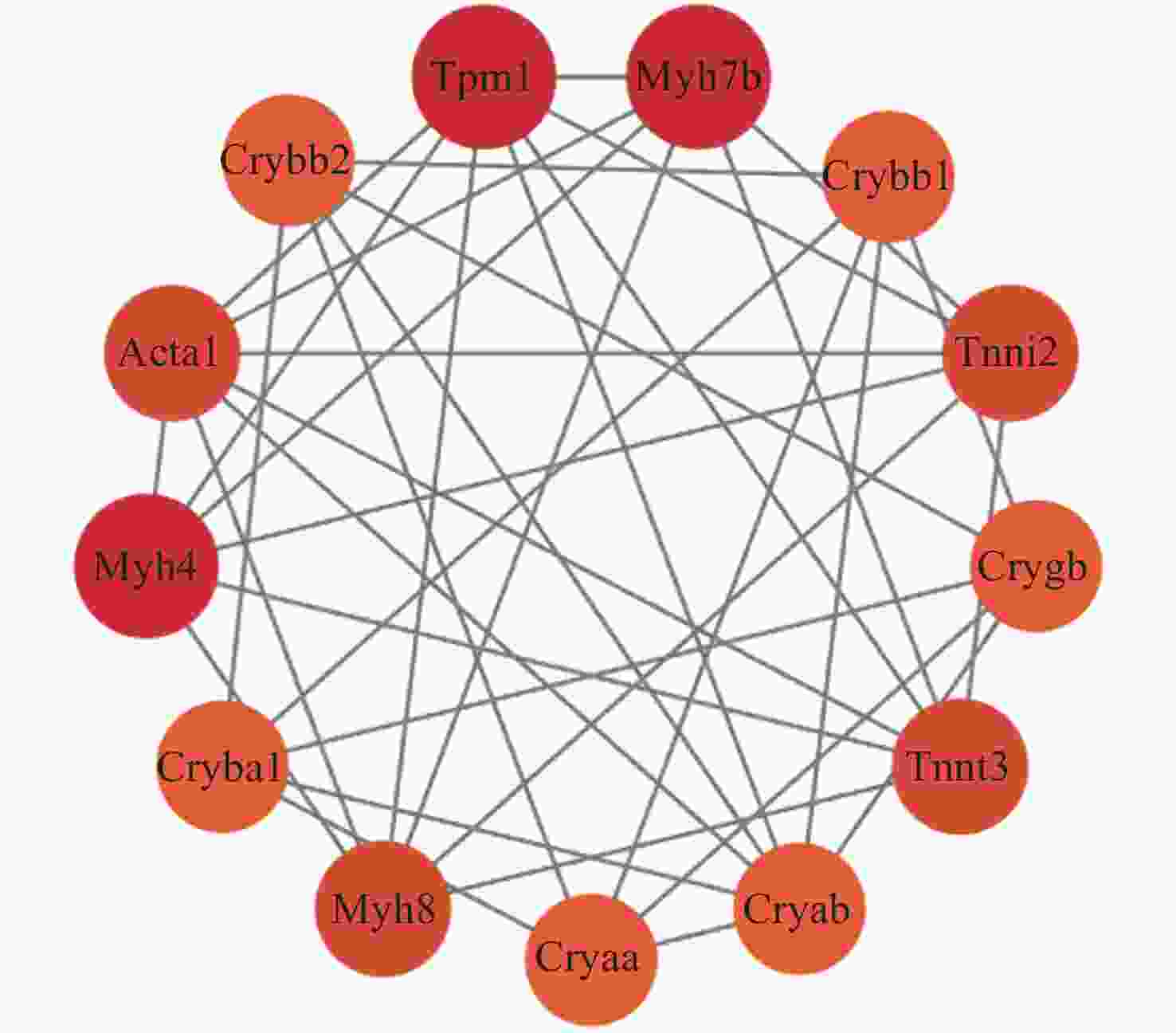 Name Rank Score ACTA1 1 13 CRYAB 2 12 TPM1 3 11 TNNT3 4 9 TNNI2 4 9 MYH4 6 8 MYH8 6 8 CSRP3 6 8 CRYBB1 9 7 PXN 9 7 表 5 最重要模块的蛋白组成(微重力环境)