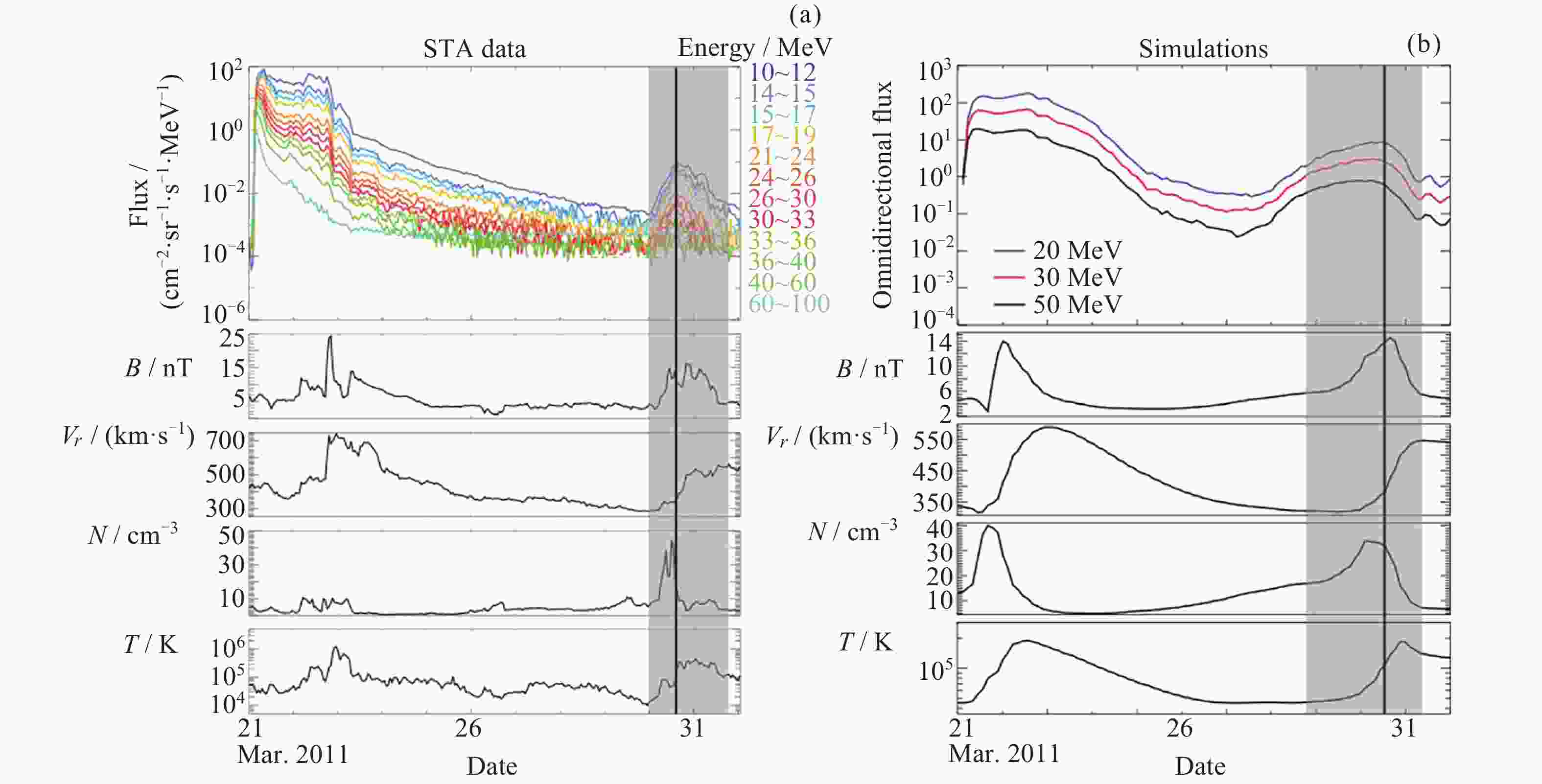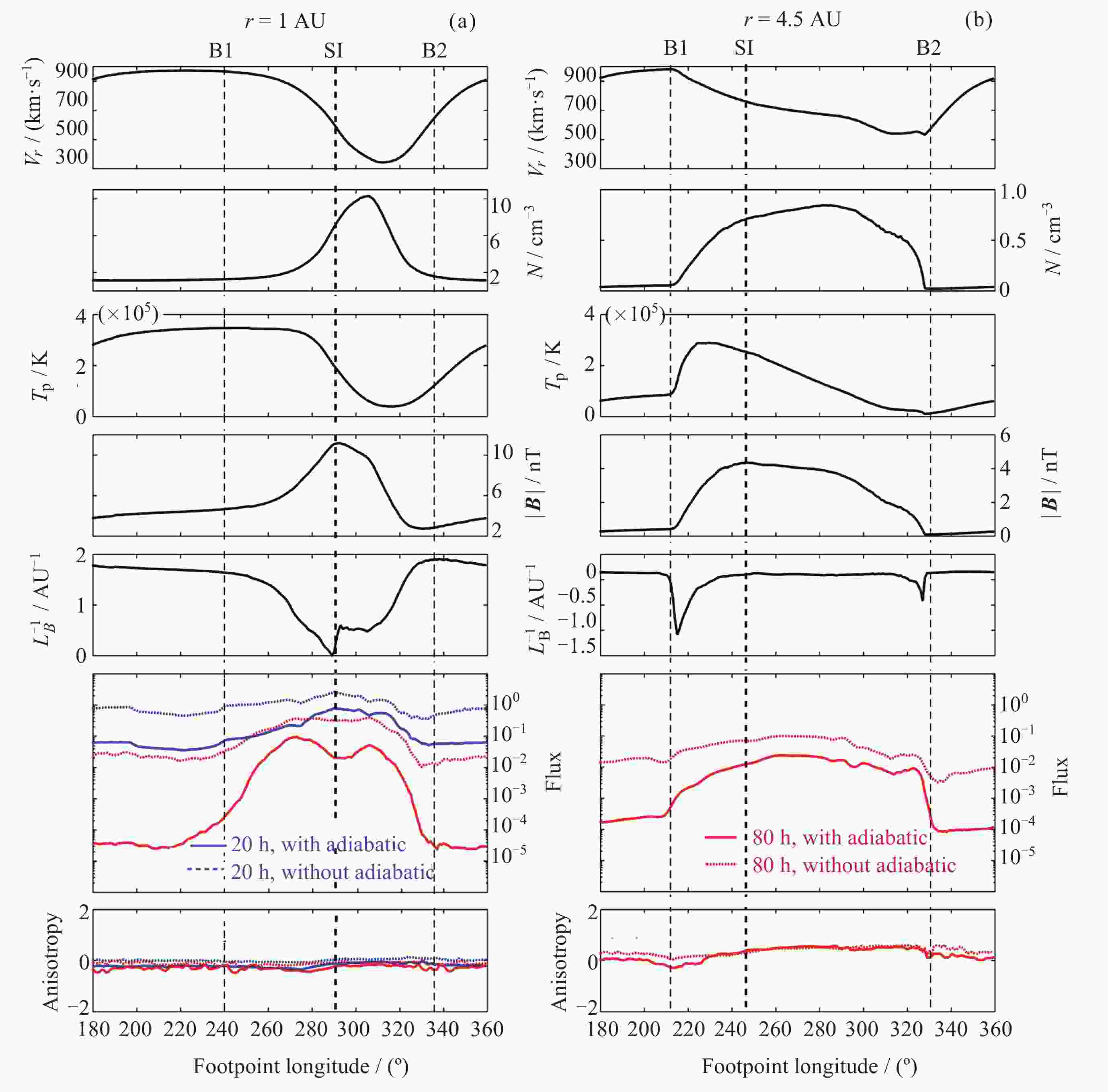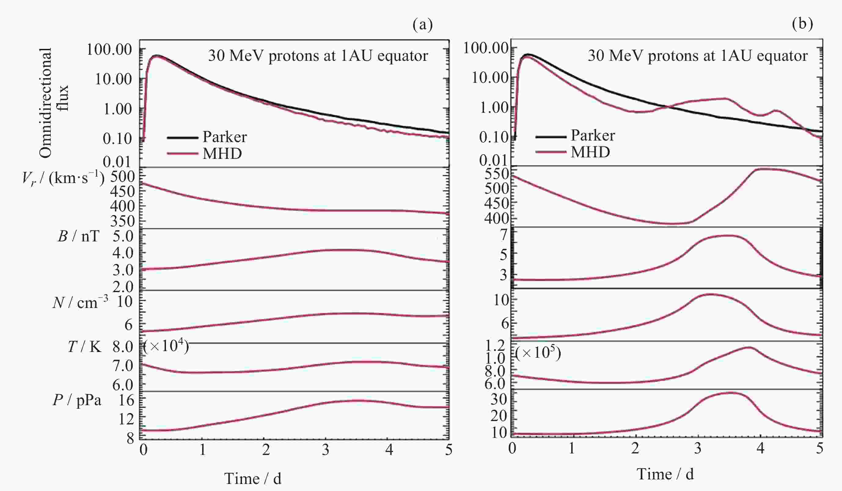 图 11 不同太阳风参数对粒子通量的影响. (a)在未压缩太阳风条件下具有两个不同背景场和太阳风参数的全向通量, (b)在压缩区域具有两个不同背景场和太阳风参数的全方位通量[16]