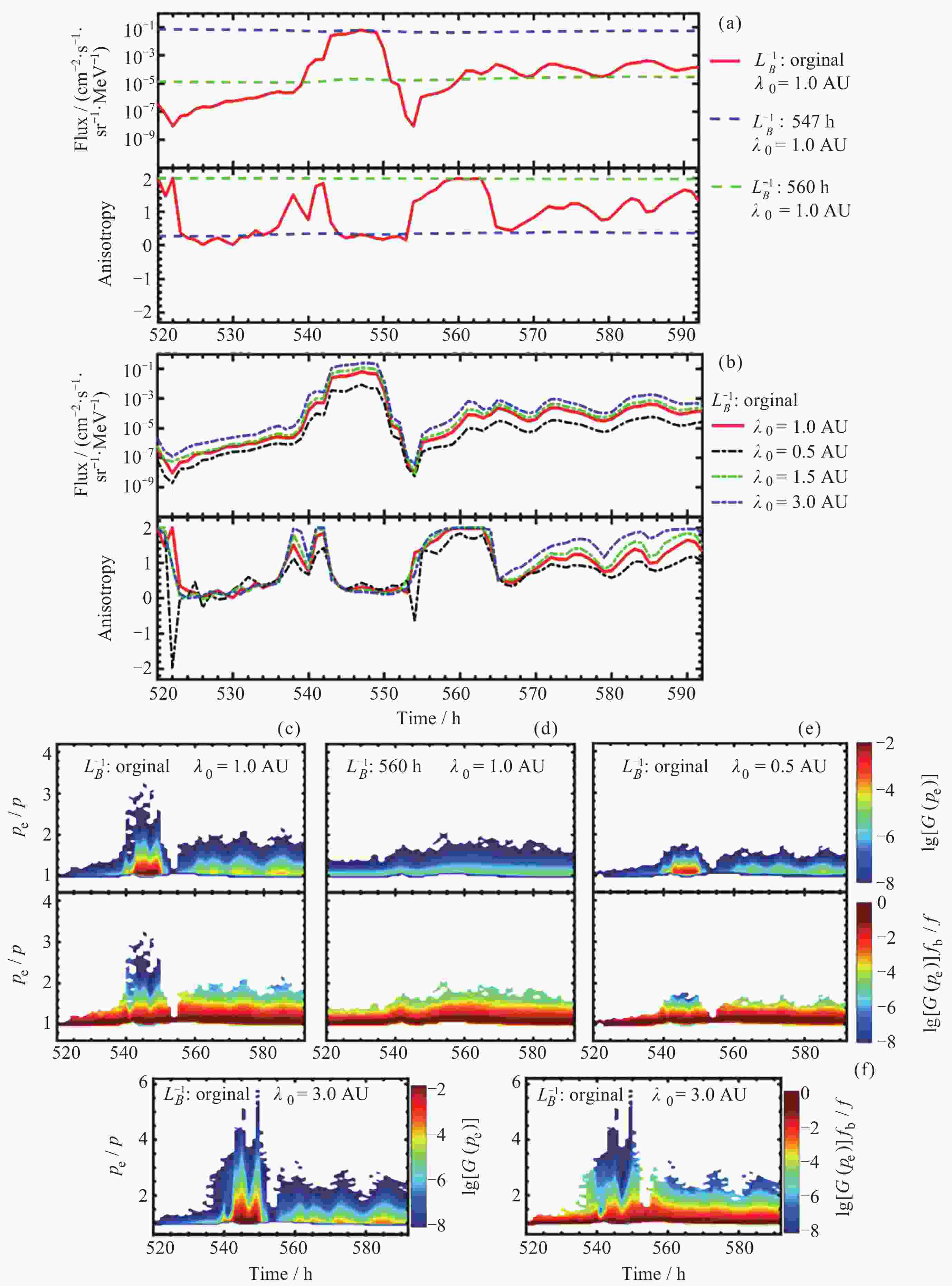 Figure 5. Effects of magnetic focusing and pitch-angle scattering on the flux enhancement of 5 MeV proton propagation. (a) Results obtained by altering the strength of the magnetic focusing effect described by the variation of $ {L}_{B}^{-1} $. (b) Effect of pitch - angle diffusion by setting different values of λ0. (c)~(f) Contour plots of $ \mathrm{l}\mathrm{g}\left[{G}\right({{p}}_{\mathrm{e}}\left)\right] $ and $ \mathrm{l}\mathrm{g}\left[{G}\right({p}_{\mathrm{e}}\left)\right]{f}_{\mathrm{b}}/f $ as functions of source particle momentum $ {p}_{\mathrm{e}}/p $ and observation time[12]