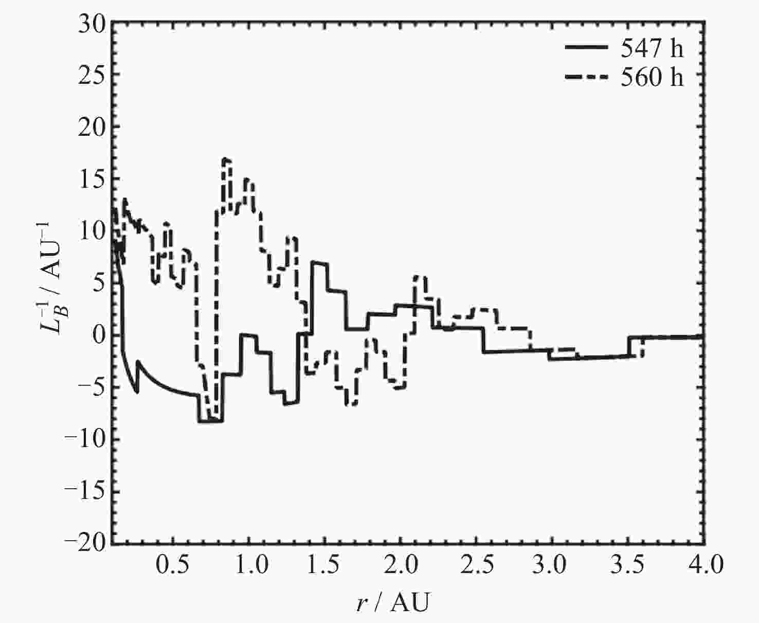 图 5 5 MeV的质子传播磁聚焦和投掷角扩散对通量增强的影响. (a) 通过改变由 $ {L}_{B}^{-1} $变化描述的磁聚焦效应强度得到的结果. (b) 通过设置不同的λ0值得到的投掷角扩散的影响. (c)~(f) $ \mathrm{l}\mathrm{g}\left[{G}\right({{p}}_{\mathrm{e}}\left)\right] $和 $ \mathrm{l}\mathrm{g}\left[{G}\right({p}_{\mathrm{e}}\left)\right]{f}_{\mathrm{b}}/f $作为源粒子动量$ {p}_{\mathrm{e}}/p $和观测时间函数的等高线[12]