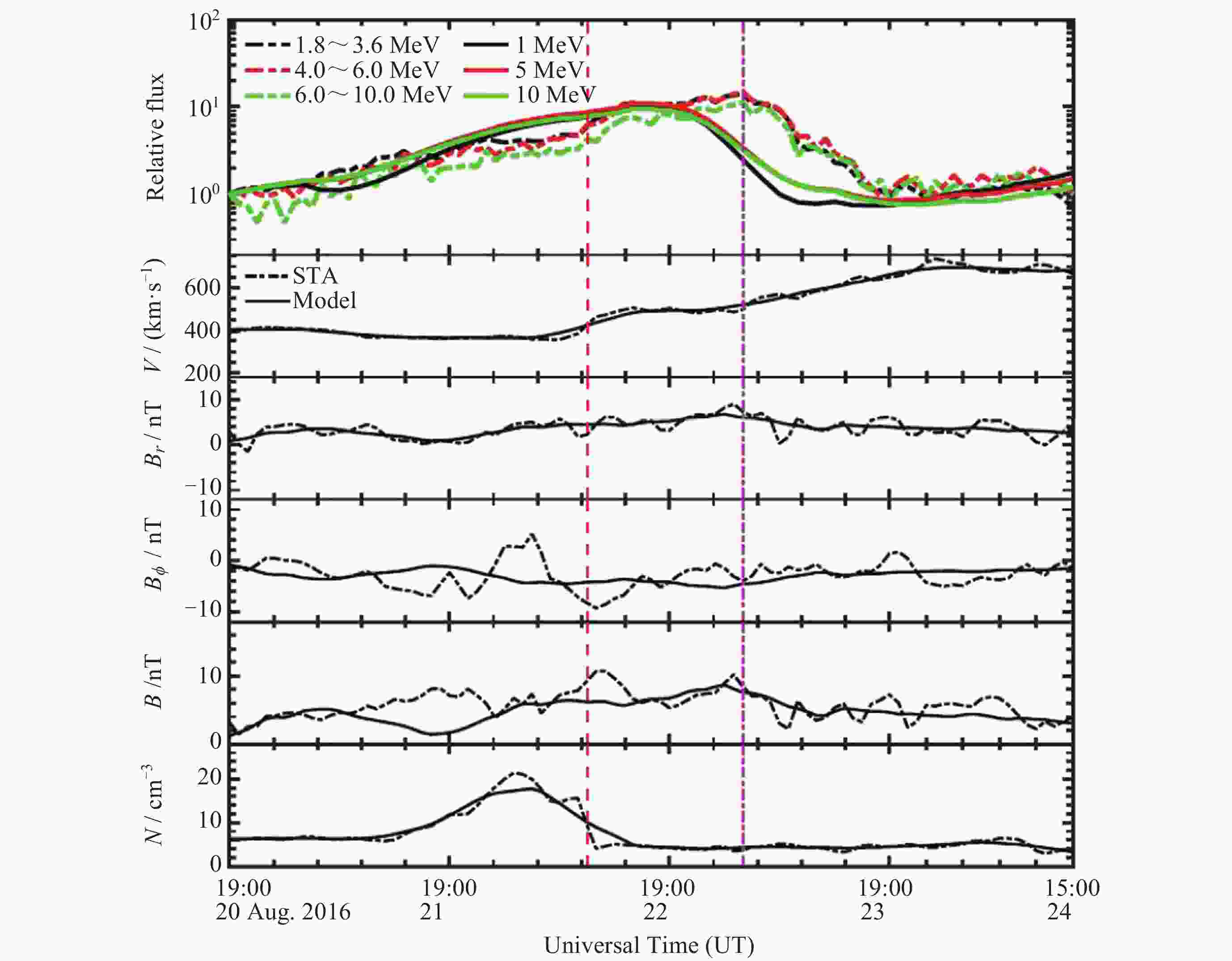 图 1 2016年7月31日至8月26日STA探测器在1 AU处观测的太阳风多参数与背景模型对比时序.蓝色阴影区表示研究所关注的共转相互作用区(CIR)结构[12]