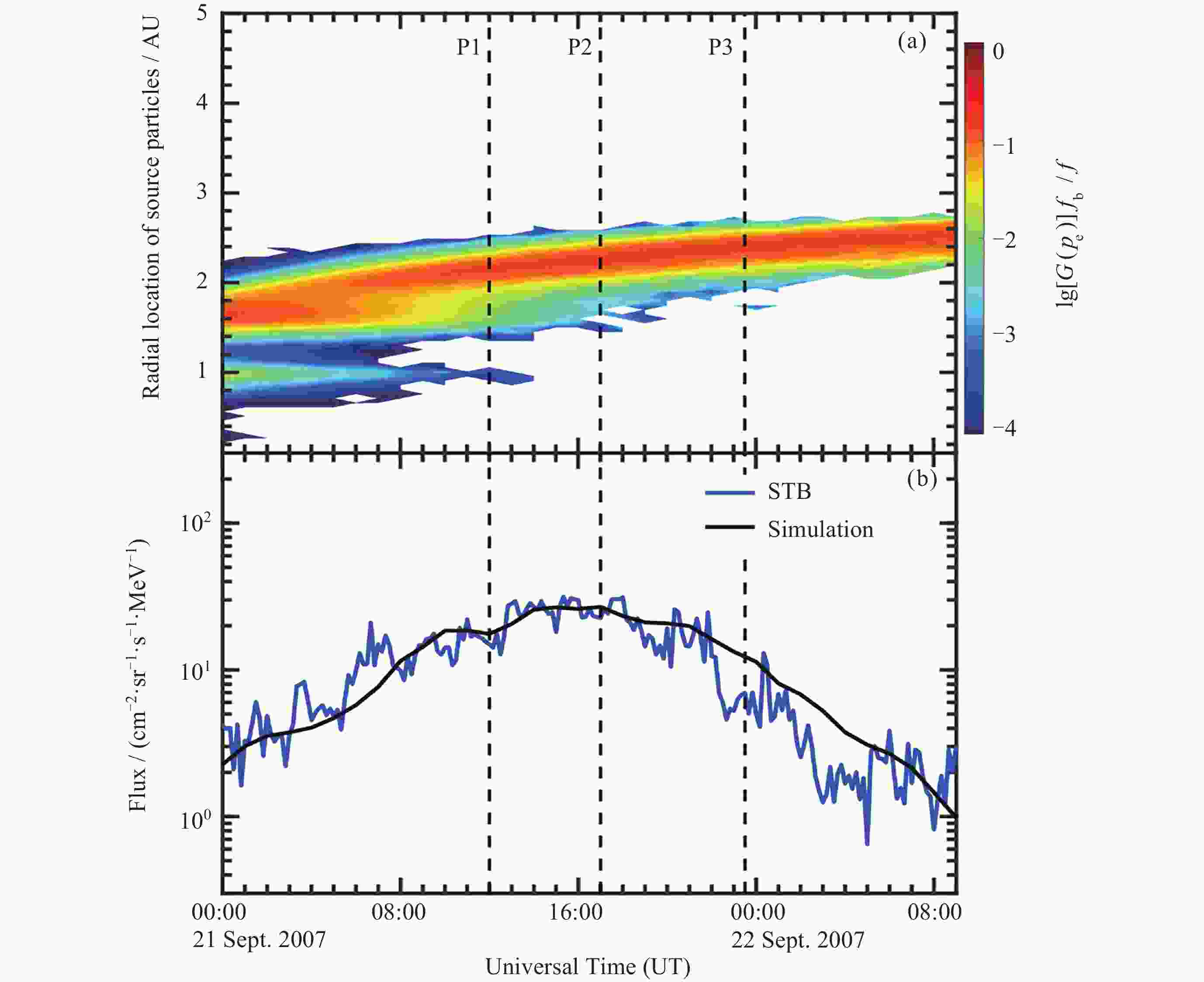 图 9 源粒子径向分布与平均积分强度的时变演化[13] (P1, P2, P3虚线分别依次对应高能粒子事件的上升、峰值和下降阶段)