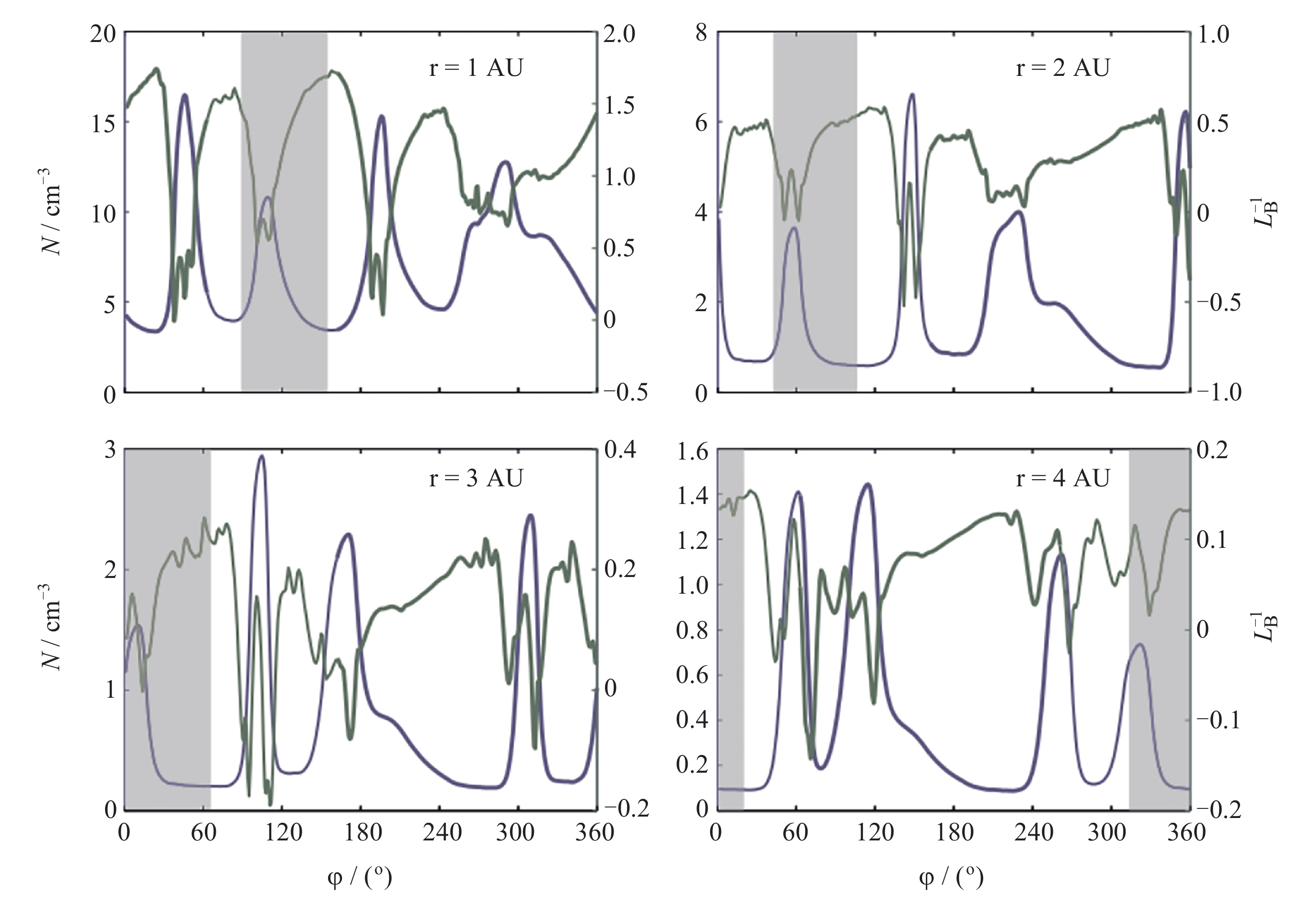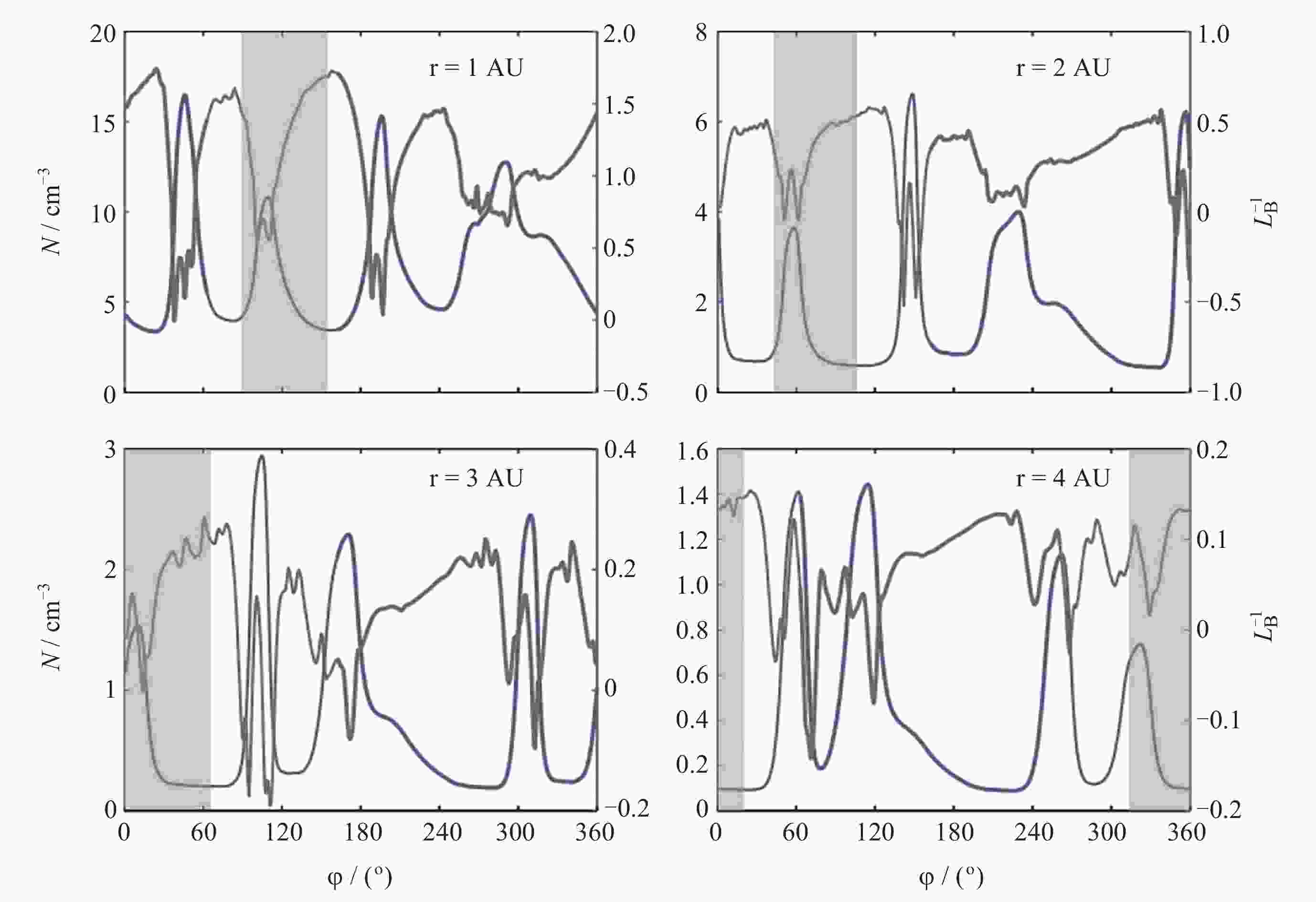 Figure  12.  Variations of N and $ {L}_{B}^{-1} $ at different heliocentric distances during CR2145 (The gray area is the region between the black magnetic field lines.)[16]