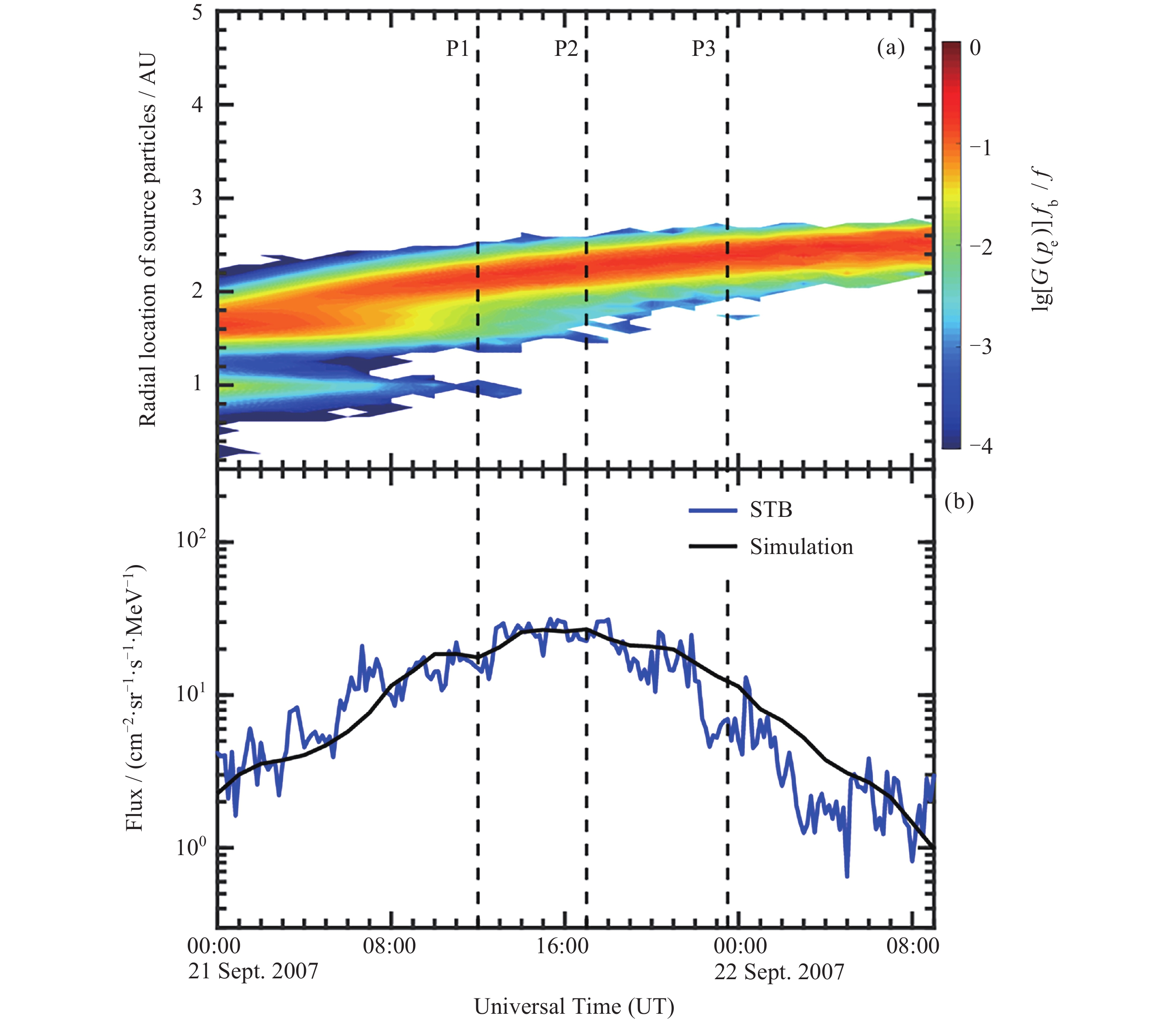 Figure  9.  Temporal evolution of the radial distribution and average integrated intensity of source particles[13] (The dashed lines P1, P2, and P3 correspond sequentially to the rise, peak, and decline phases of the high-energy particle event.)