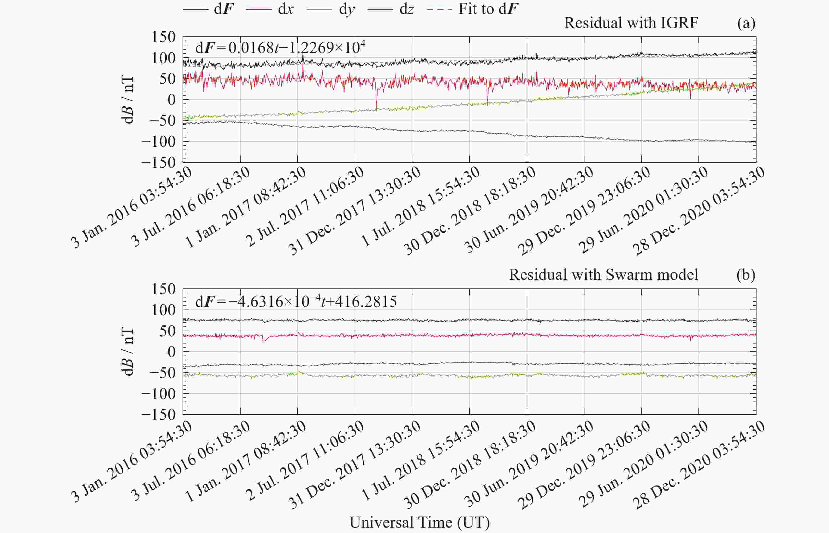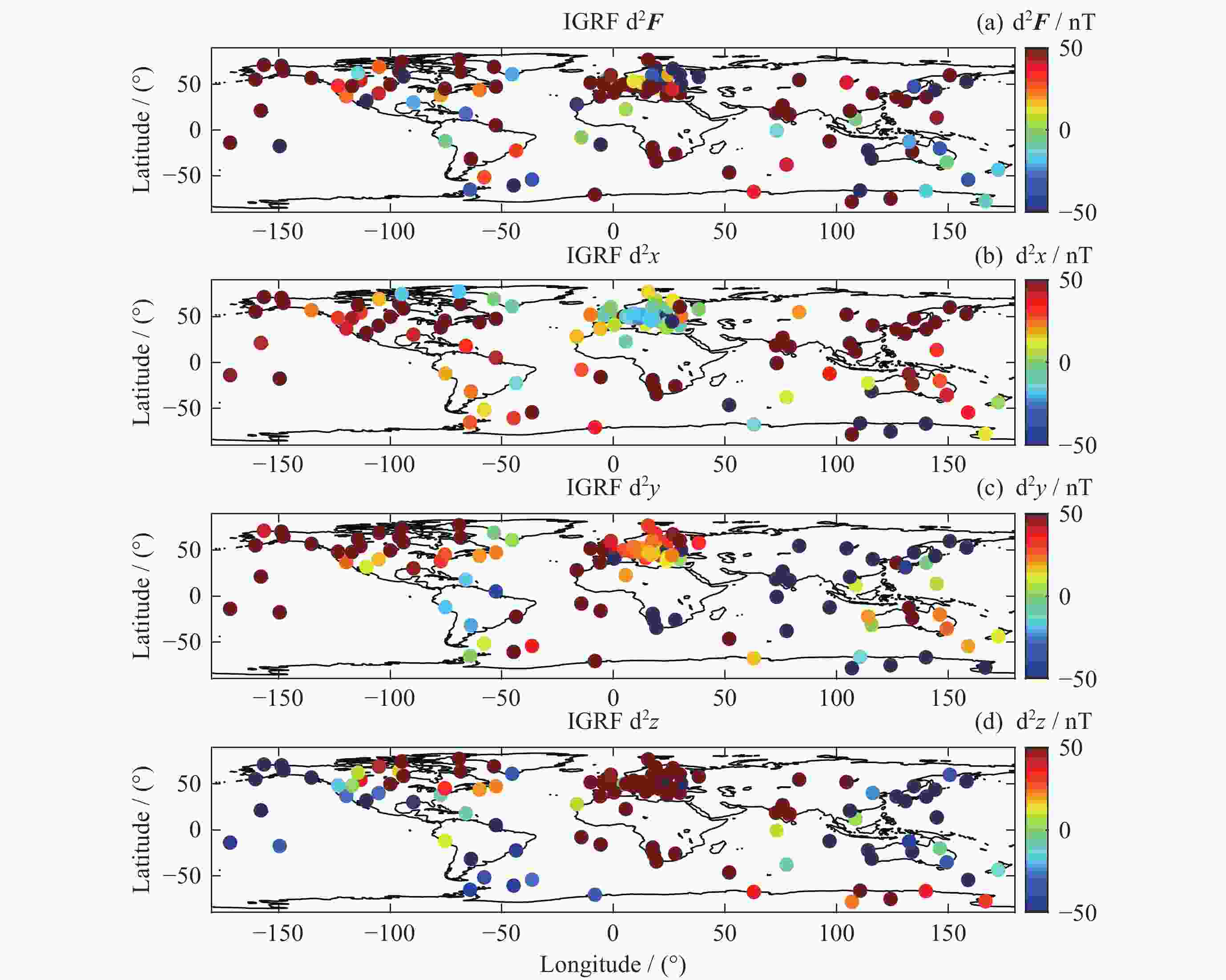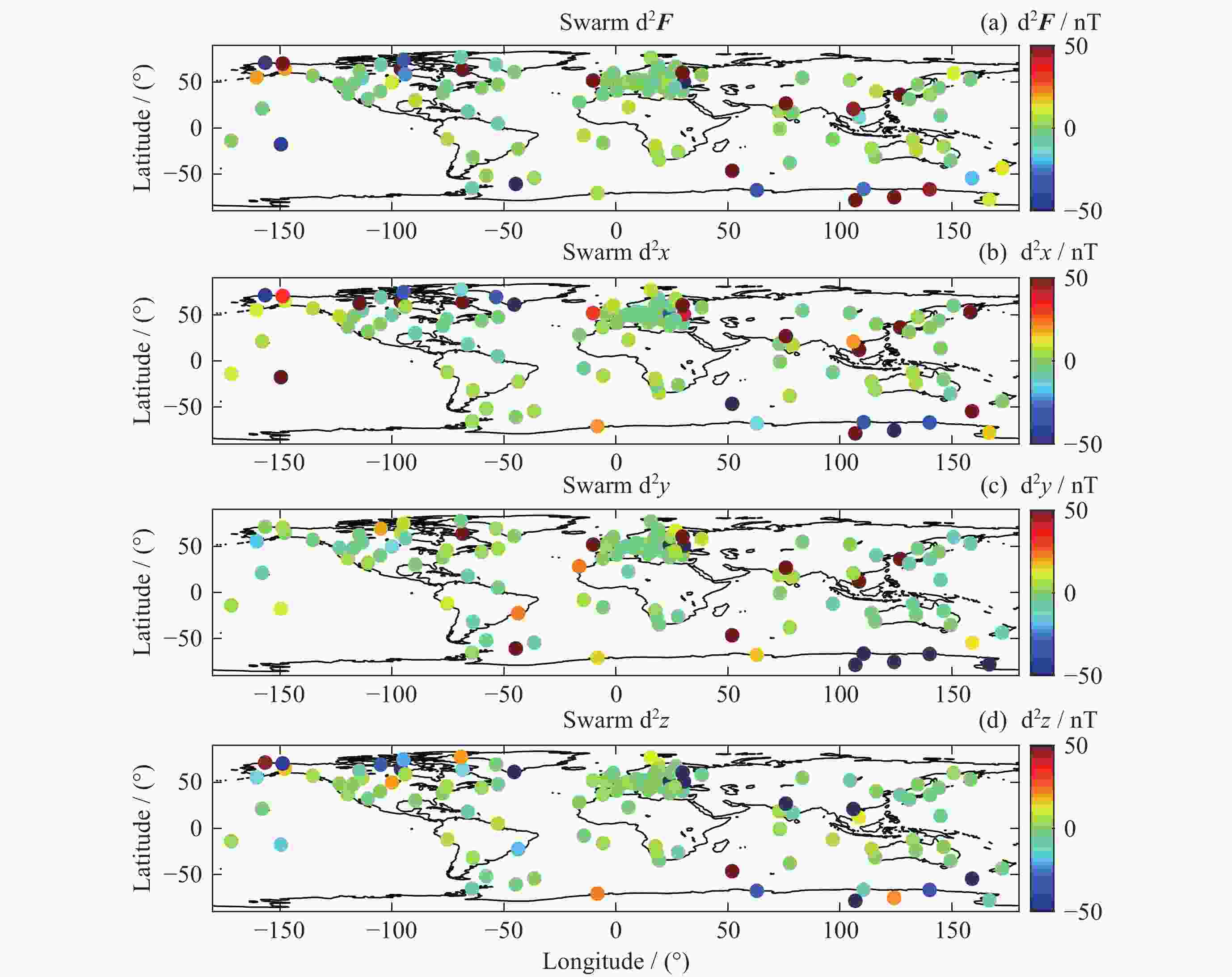 模型 d2F/nT d2x/nT d2y/nT d2z/nT Swarm 55.2609 15.3731 39.9163 –3.8206 IGRF 95.0589 52.9819 52.6998 25.8081 表 3 模型与台站观测值差值的绝对中位差