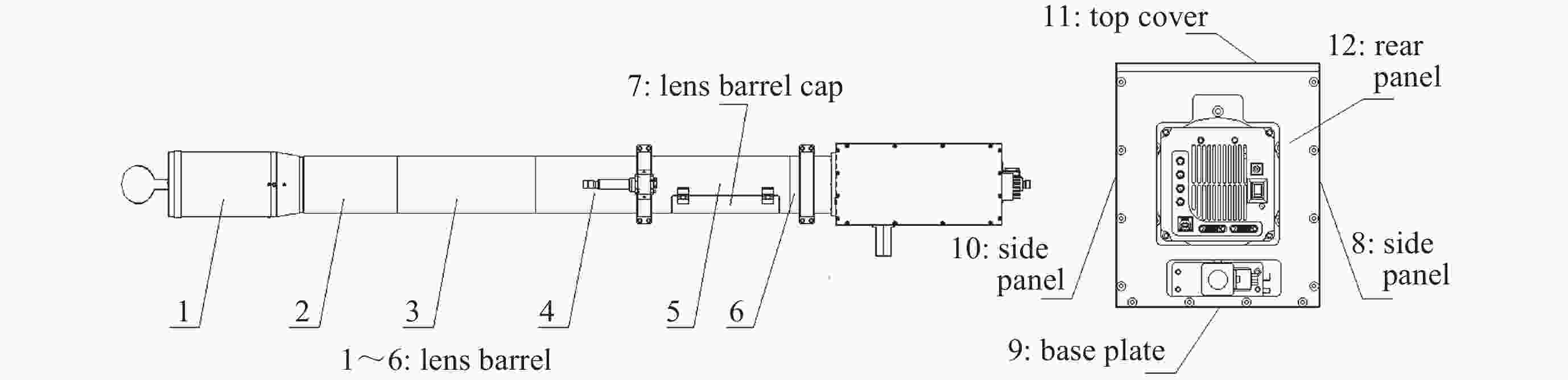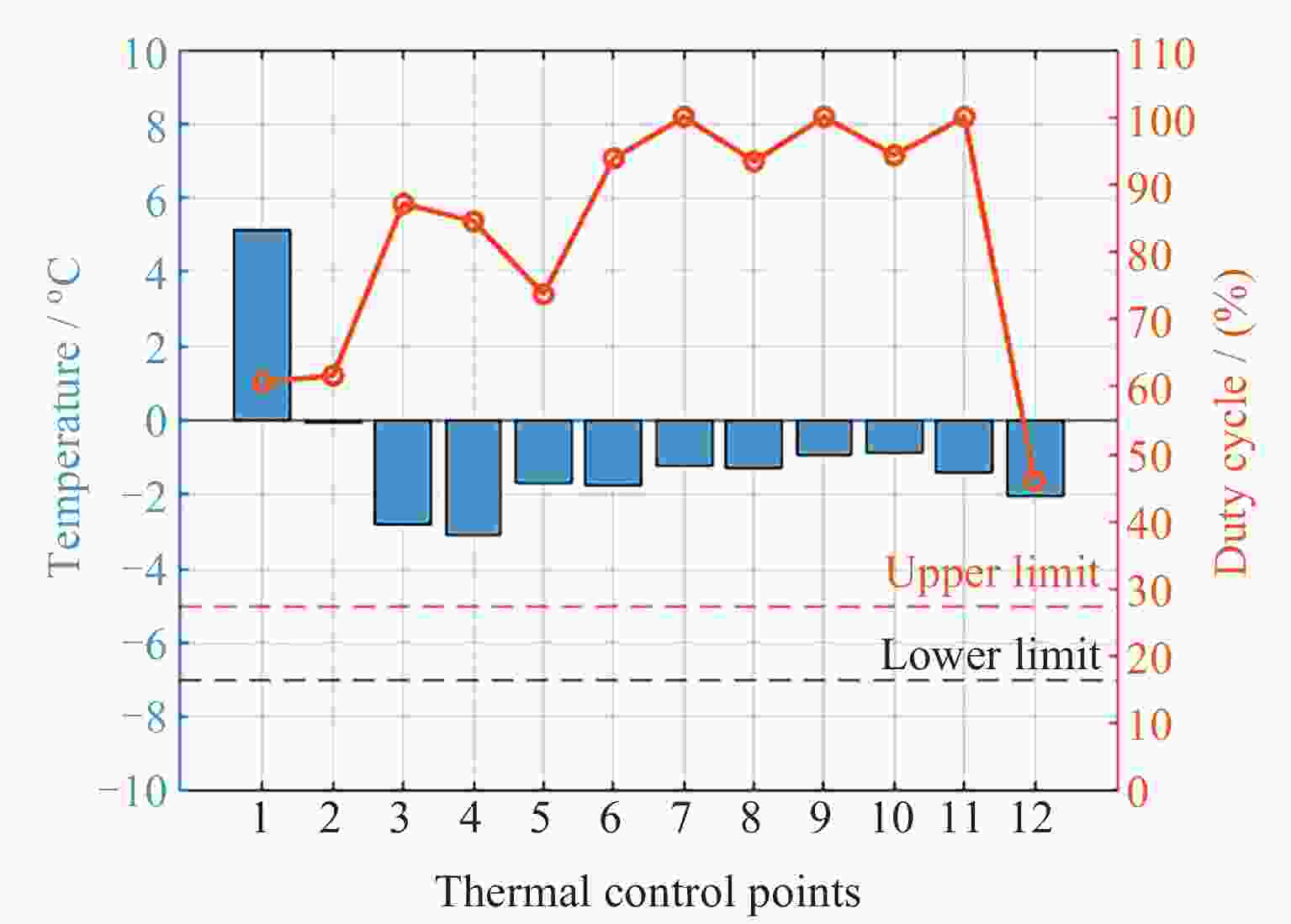 序号 加热器回路名称 加热功率/W 控温阈值/℃ 温度测控点名称 1 镜筒1 35 [–7, –5] 镜筒温度1 2 镜筒2 35 [–7, –5] 镜筒温度2 3 镜筒3 35 [–7, –5] 镜筒温度3 4 镜筒4 30 [–7, –5] 镜筒温度4 5 镜筒5 30 [–7, –5] 镜筒温度5 6 镜筒6 10 [–7, –5] 镜筒温度6 7 镜筒7 5 [–7, –5] 镜筒温度7 8 尾部X+ 15 [–7, –5] 尾部温度1 9 尾部Z+ 10 [–7, –5] 尾部温度2 10 尾部X– 15 [–7, –5] 尾部温度3 11 尾部Z– 10 [–7, –5] 尾部温度4 12 尾部Y+ 10 [–7, –5] 尾部温度5 -
