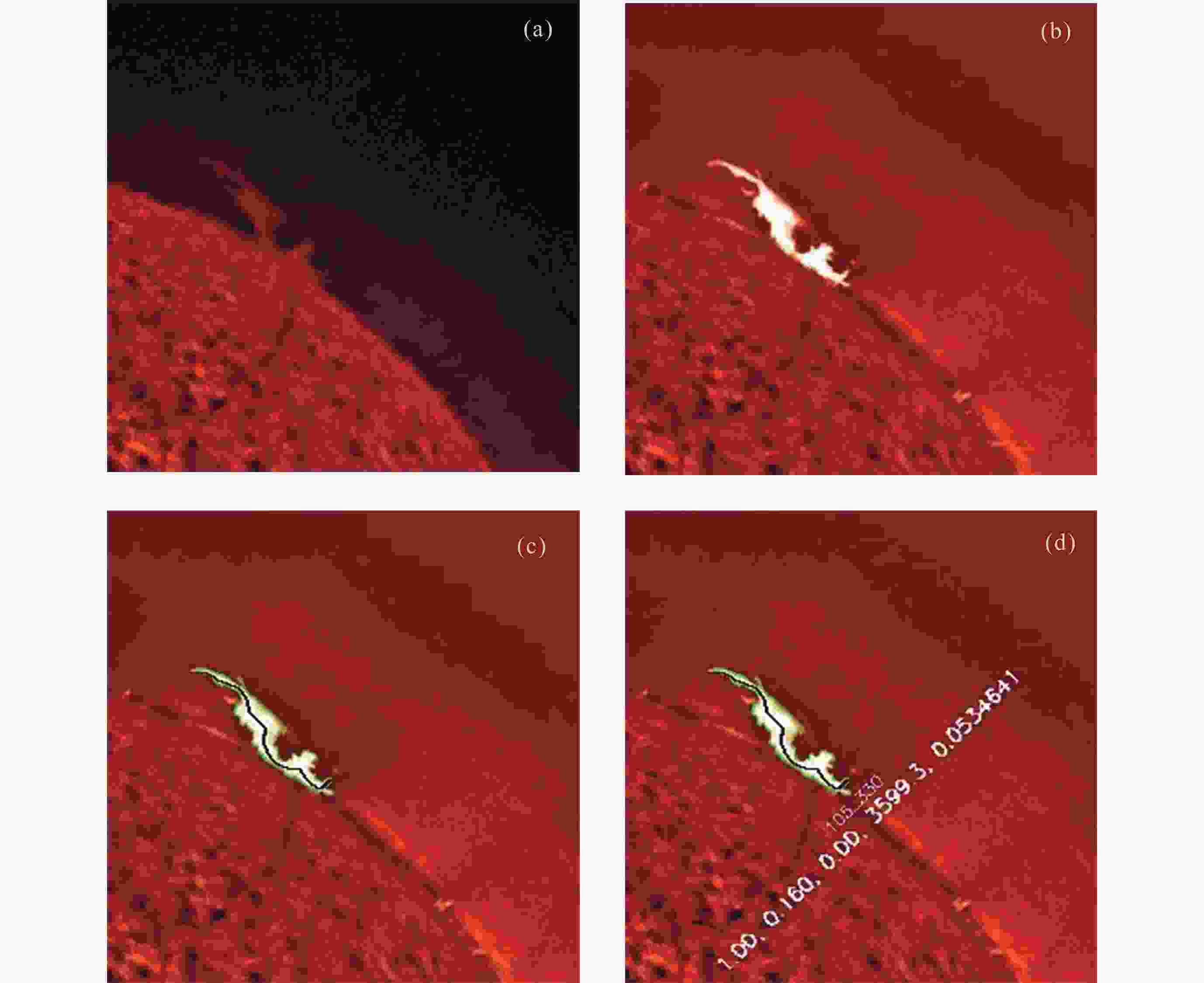 图 2 2013年11月2日23:40 UT 的单帧图像处理结果. (a) 原始图像, (b) 背景重构后的全日面图像, (c) 标记出日珥区域的全日面图像, (d) 标记出日珥区域及部分参数的全日面图像
