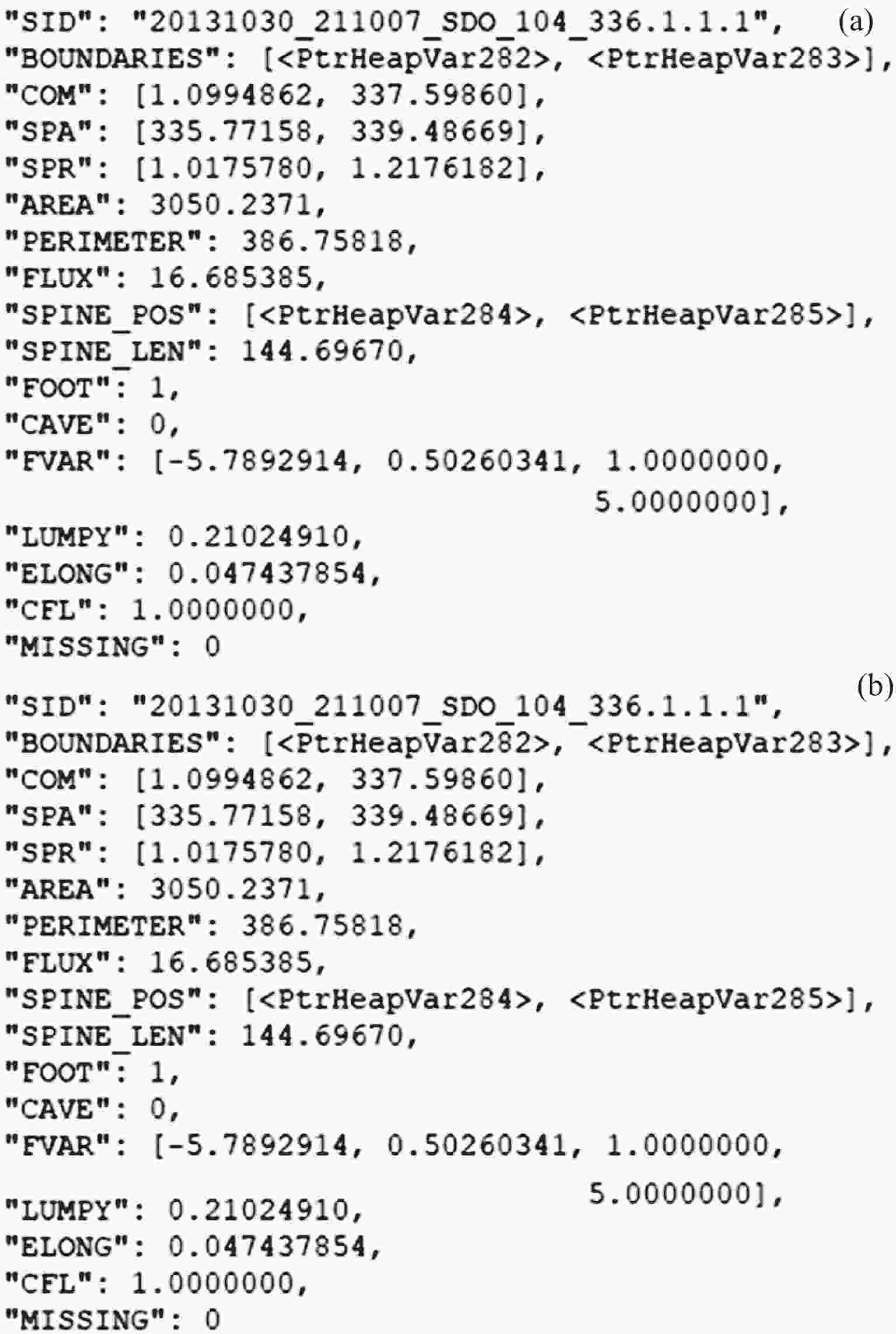 序号 参数 信息描述 1 SID 日珥 id 2 BOUNDARIES 指针型变量, 包含标记的日珥边界坐标(x, y, 单位pixel) 以及默认设定的算法阈值 (info) 3 COM 包含两个元素的一维数组, 加权后的日心距(单位为1Rs, Rs表示太阳半径)和方位角(单位为°) 4 SPA 日珥的所有像素点的最低和最高方位角 (单位为°) 5 SPR 日珥的所有像素点的最低高度和最大高度, 单位为1Rs 6 AREA 日珥的面积, 单位 Mm2 7 PERIMETER 日珥的周长, 单位 Mm 8 FLUX 日珥的总亮度, 单位 DN (Digital Number) 9 SPINE-POS 日珥中脊线 (骨架主干线) 长度, 单位 Mm 10 SPINE-LEN 日珥的骨架参数信息, 包含两个参数: skel_info为默认设定的算法阈值, skel_ xy为骨架的每个坐标点的信息, 单位 pixel 11 FOOT 日珥的足点数量 12 CAVE 未定义参数, 可以忽略 13 FVAR 包含4个元素的一维数组, LDA线性拟合过程中的结果参数 14 LUMPY 日珥的形态学参数定义为日珥面积与日珥区域像素坐标最远距离为直径的圆面积比值. 如果比值接近1, 说明日珥的区域形状接近正圆 15 ELONG 日珥的形态学参数定义为中脊线长度与日珥面积的比值. 比值越接近1, 说明日珥长宽比越大; 比值越接近0, 说明日珥越接近正圆 16 CFL 日珥的置信度, 非1代表非日珥, 1代表日珥 17 MISSING 中间参数可以忽略 -