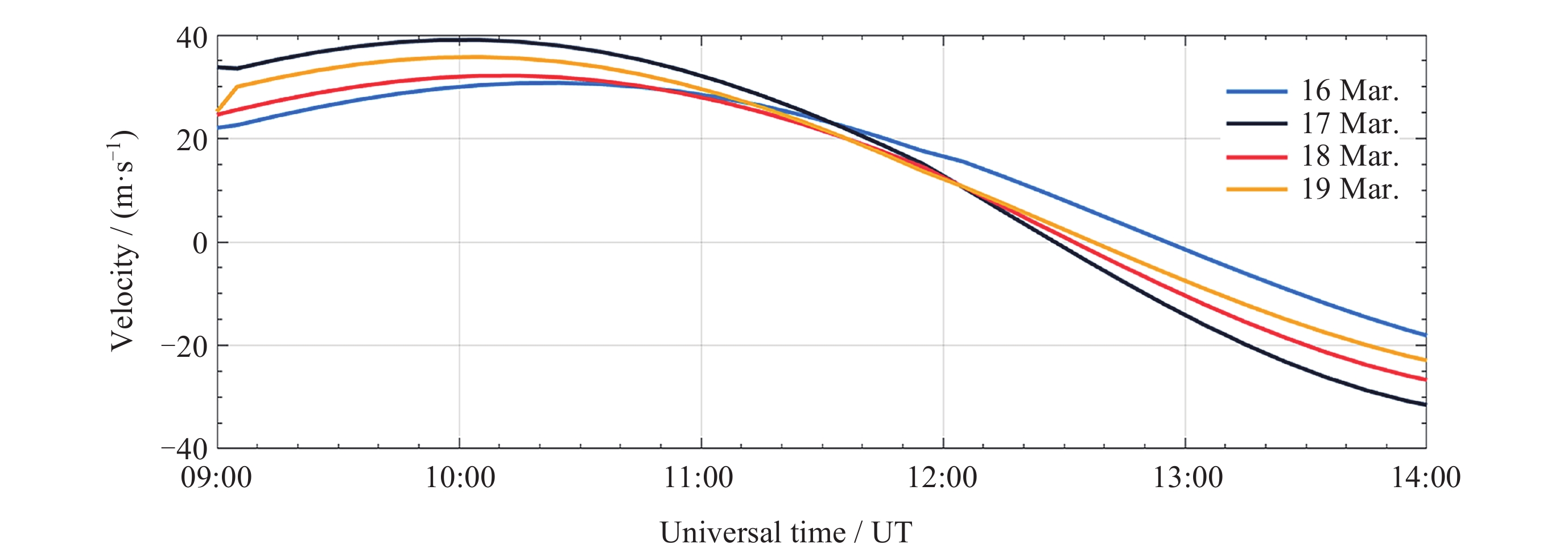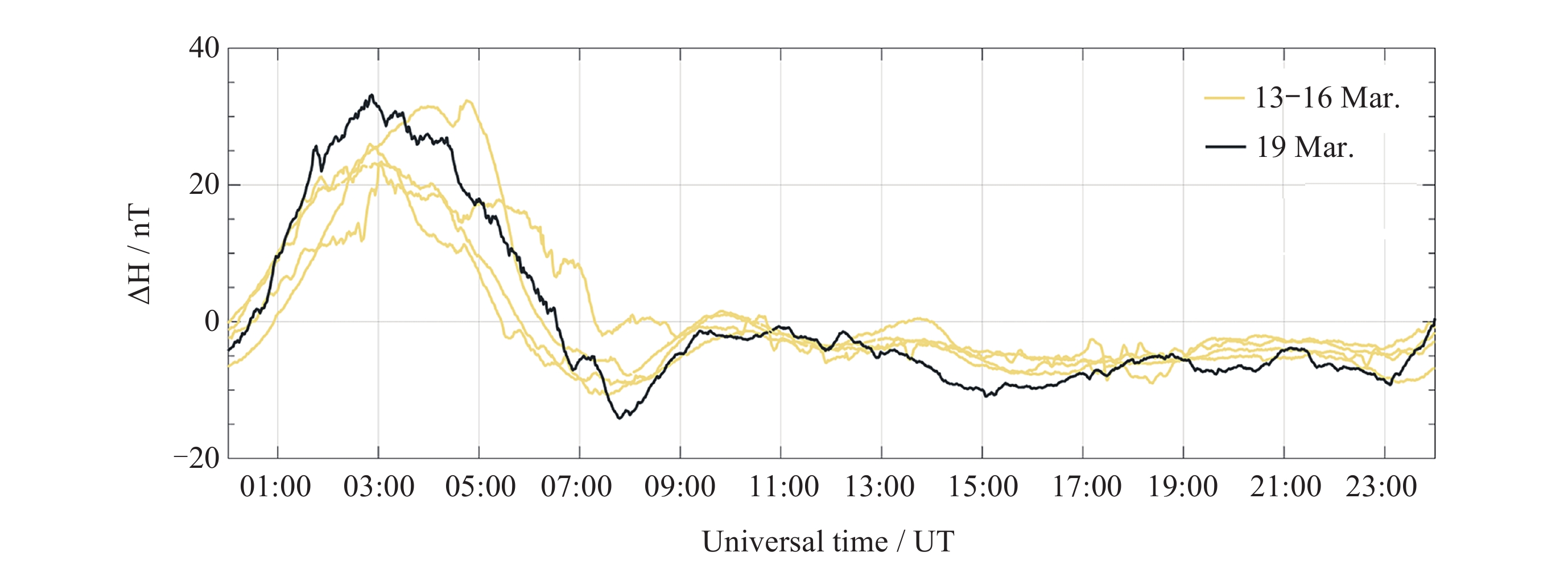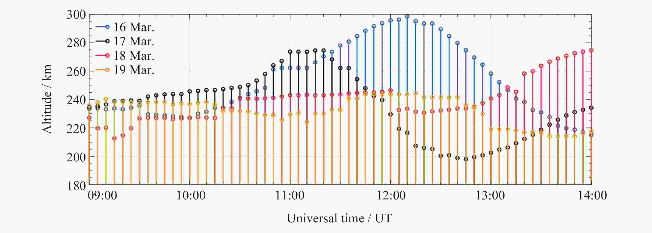 日期 电离层不规则体出现时间 (UT) 2015年3月13日 12:13 -13:23, 14:27-15:23 2015年3月14日 12:00-12:20, 13:18-15:16 2015年3月15日 12:26-12:46, 14:57-17:59 2015年3月16日 12:20-13:23, 14:49-15:29 -