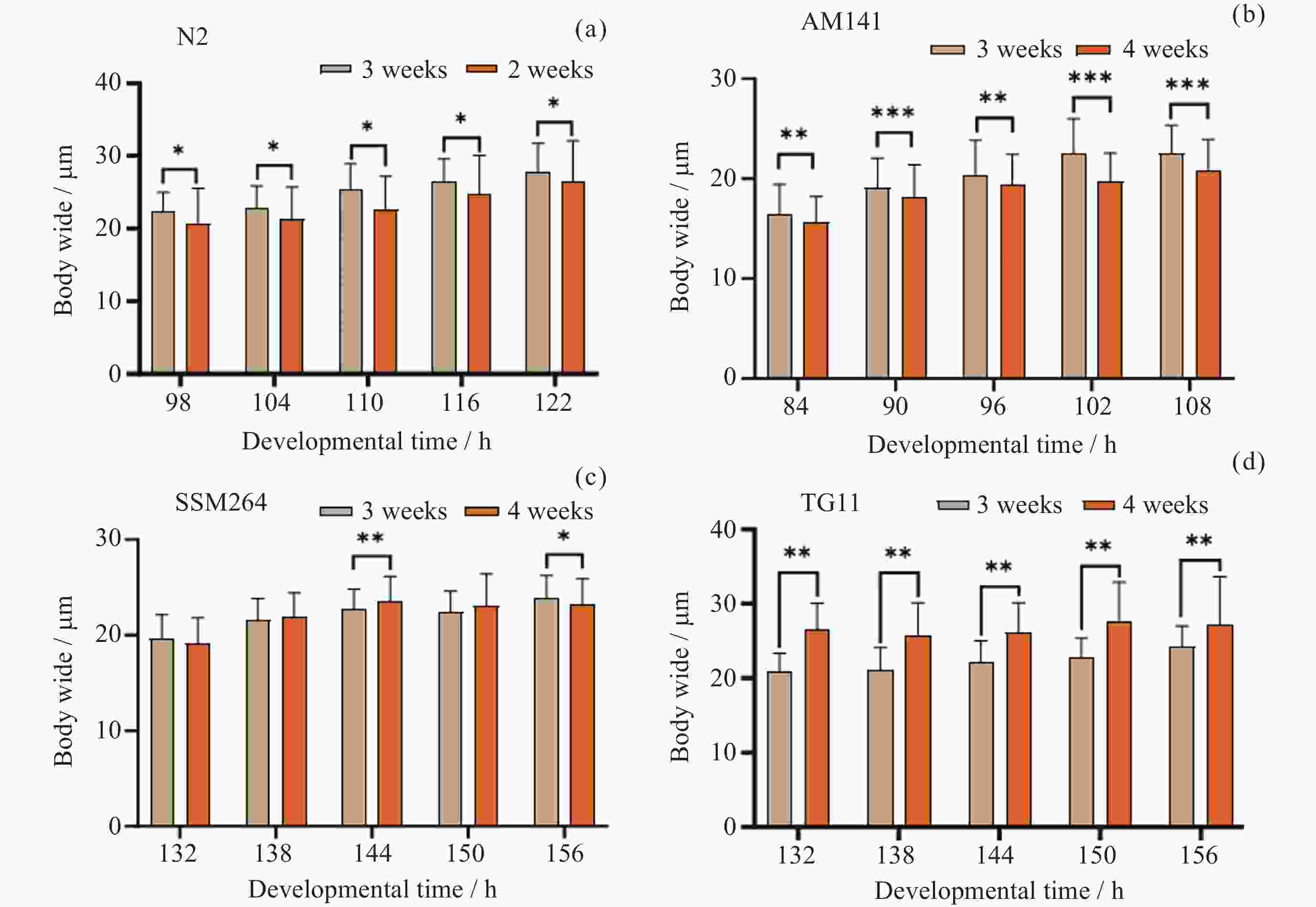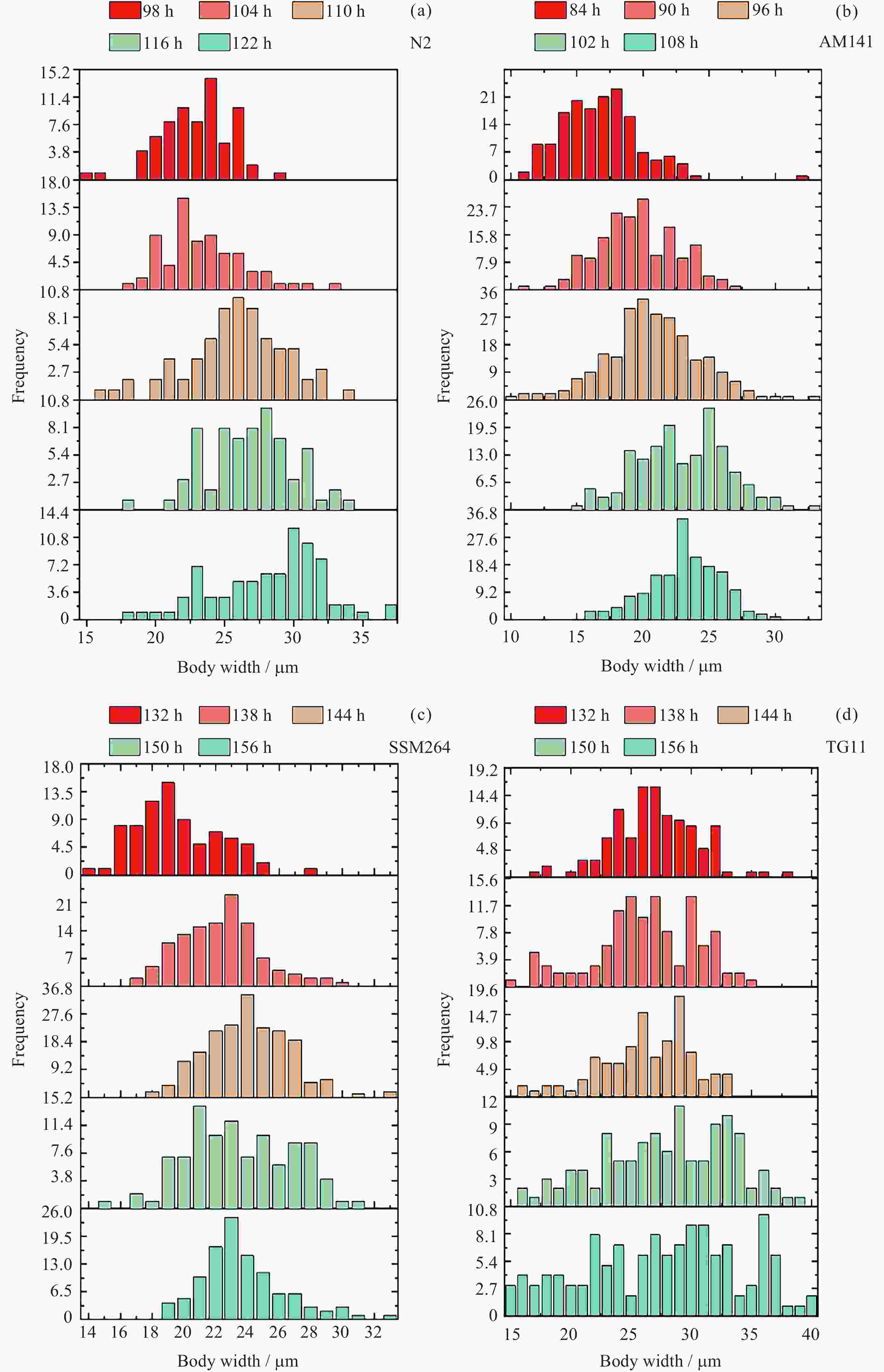 N>29μm84 16.36 0.00 $\infty $ 90 19.12 5.65 $\infty $ 96 20.26 8.28 $\infty $ 102 22.55 5.88 $\infty $ 108 22.57 17.02 40.00 表 4 SSM264线虫同步化后各发育时间体宽分布