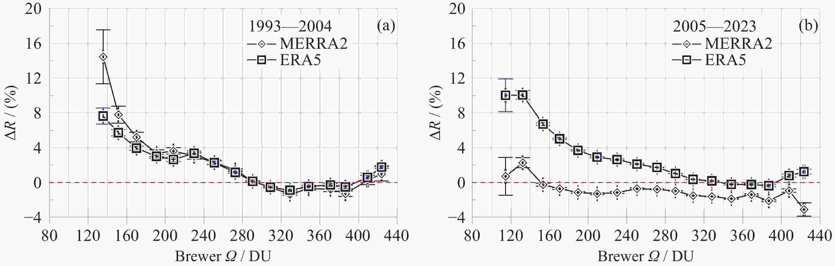 摘要: 基于南极中山站1993-2023年Brewer光谱仪地基观测大气臭氧总量(Ω), 对再分析数据MERRA2和ERA5的臭氧总量进行验证、评估和趋势分析. 研究发现, 再分析数据与地基测值在反映南极臭氧洞及臭氧总量季节变化方面是一致的. 日均 MERRA2和ERA5的臭氧总量差异浓度值(ΔΩ )分别为–2.0±9.6 DU和3.2±7.8 DU, 相对差异分布均呈随机特征. 1993-2004年和2005-2023年两个时段的臭氧洞(地基Ω ≤220 DU)期间, MERRA2的相对差异百分比 ΔR 均值分别为6.9% ± 4.6%(1σ)和–0.4% ± 2.3%(1σ), 而ERA5则分别为4.6% ± 2.0%(1σ)和6.4% ± 3.1% (1σ); 随着太阳天顶角θ 的上升, MERRA2 与ERA5的 ΔR 在1993-2004年分别呈现总体幅度为3%和2%的上升, 而在2005-2023年则分别呈–2%下降和2%上升; 2005-2023年的再分析臭氧总量数据质量优于1993-2004年. 经Brewer光谱仪测值订正后的再分析数据均表现出ΔΩ 的恢复态势, 其中ERA5的恢复速率每10年为 1.3 DU . 再分析数据在被地基验证和订正之前应慎用于评估南极大气臭氧总量长期趋势变化. 地基臭氧总量观测时数虽然受太阳天顶角或天气影响而远低于再分析数据, 但对再分析数据的验证是评估臭氧总量长期变化的关键依据.Abstract: Based on the Brewer ozone spectrophotometer long-term (1993-2023) observations at Zhongshan Station, Antarctica, the atmospheric Total Ozone Column (TOC) of the MERRA2 and ERA5 reanalysis are compared, evaluated, and their trends are analyzed. The results show that the reanalysis is generally in good agreement with the ground-based data in the context of occurrence of the ozone hole and the TOC seasonality. The TOC bias (ΔΩ) on the daily mean scale is –2.0±9.6 DU and 3.2±7.8 DU for MERRA2 and ERA, respectively. Both the probability distributions of the reanalysis ΔΩ exhibit normal random processes and their large variations occurred at the end of March and during the ozone hole period. The reanalysis data were divided into two periods, 1993-2004 and 2005-2023, based on the changes of satellites to which the reanalysis data were assimilated, but the ΔTOC values (including ERA5) during the ozone hole increases with decreasing of the TOC in the both periods, and the ΔR values for MERRA2/ERA5 were respectively 6.9%±4.6%(1σ)/ 4.6%±2.0%(1σ)and –0.4%~2.3%(1σ)/ 6.4%±3.1%(1σ). The ΔR of MERRA2 and ERA5 show an increasing trend with the Solar Zenith Angle (SZA) during 1993-2004, with each magnitude of 3% and 2%, while the opposite trend is observed from 2005 to 2023, with magnitudes of –2% and 2% for MERRA2 and ERA5, respectively. The quality of reanalysis TOC data from 2005 to 2023 is superior to that from 1993 to 2004. Both the reanalysis TOC data validated by Brewer show their consistent recovery trends of TOC, and the linearly fitted recovery rate of ERA5 is 1.3 DU per decade. The study suggests that raw reanalysis TOC data should be used with much caution before evaluating the long-term trends of the ozone layer, and the data from the ground-based observations, although the number of the data is much less than that of reanalysis outputs due to seasonal SZA or weather conditions, is critical for the reanalysis TOC validation and conclusions of the TOC trend.