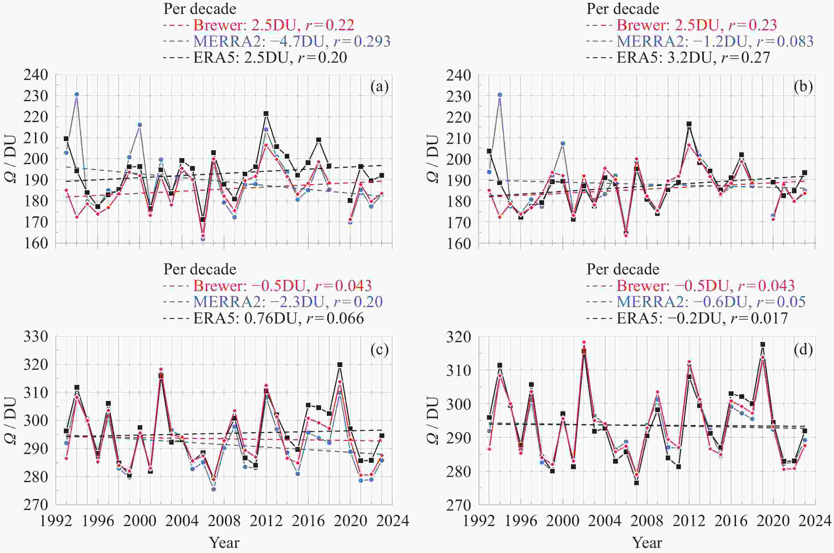 图 8 1993-2023 年南极中山站Brewer光谱仪, MERRA2和ERA5年均臭氧总量的变化及线性拟合趋势比较. (a) 原始臭氧总量数据呈现的臭氧洞趋势, (b) Brewer原始数据及订正再分析臭氧总量数据呈现臭氧洞趋势; (c) 同(a)但为非臭氧洞趋势 , (d)同(c) 但为非臭氧洞趋势