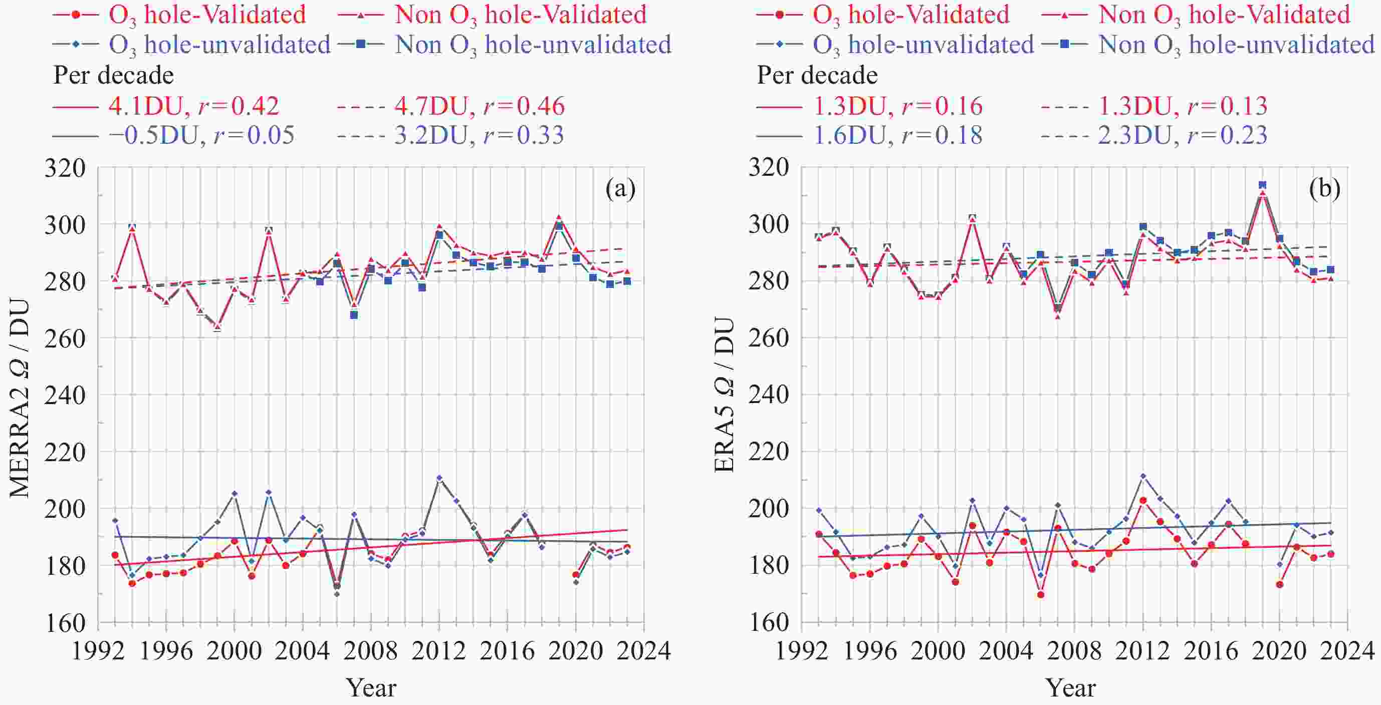 Figure 8. Comparison of yearly means TOC variations and their linearly fitted trends of Brewer, MERRA2 and ERA5 at Zhongshan Station Antarctica in 1993-2023. (a) Ozone hole trends with raw TOC data, (b) ozone hole trends with validated reanalyzed TOC data, (c) same as (a) but for non-ozone hole trends, (d) same as (b) but for non-ozone hole trends