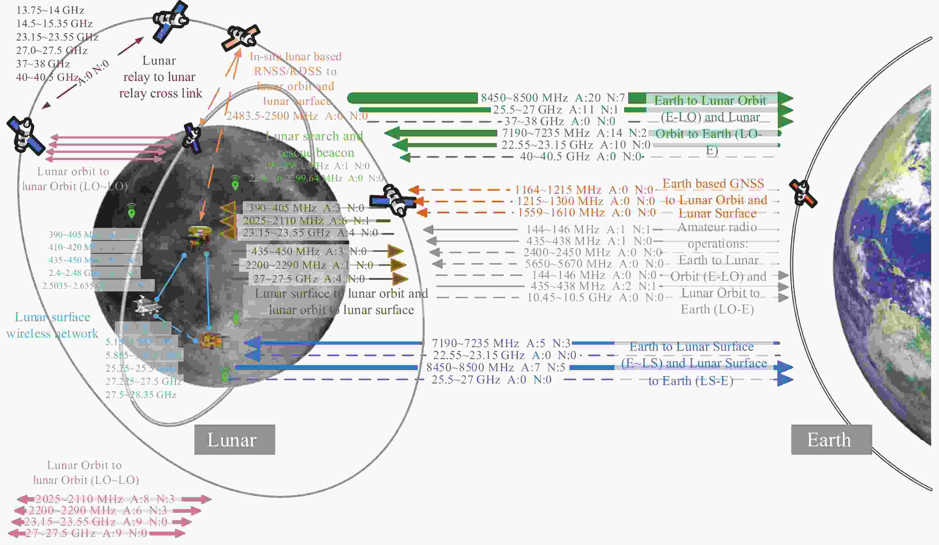 国家 卫星网络资料名称 国际电信联盟收妥日期 中国 CE-1 2007-09-20 美国 THEMIS-LUNAR 2010-05-11 中国 LUNAR LANDER 2013-03-05 中国 LUNAR ROVER 2013-03-05 中国 DSLWP 2018-04-03 中国 LUNAR CTDRS-1 2019-09-05 中国 LUNAR S-SAT 2019-09-05 俄罗斯 LUNA-GLOB 2020-08-04 美国 ORION 2020-11-26 意大利 ARGOMOON 2020-12-23 美国 CAPSTONE 2021-07-09 美国 LRO 2021-07-09 美国 ORION MPCV 2021-08-06 韩国 KPLO 2021-10-12 印度 LMI 2022-08-11 日本 HAKUTO-R-L1 2022-10-10 表 4 地月空间卫星网络资料空间研究业务频段统计数据