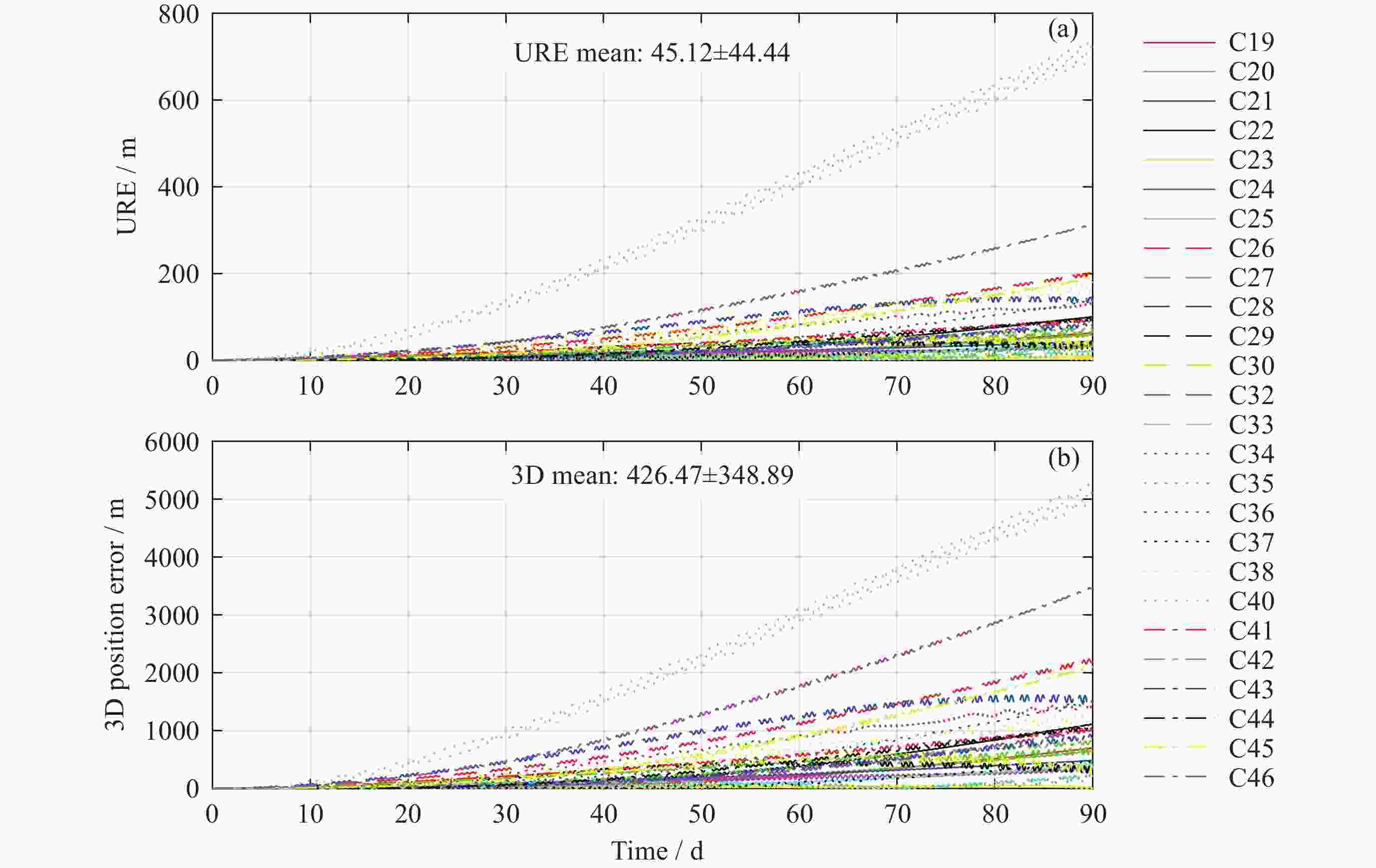 Table 4. Position error RMS statistics on the 90th day of Beidou navigation satellites’ long-term orbit prediction (Unit: m)