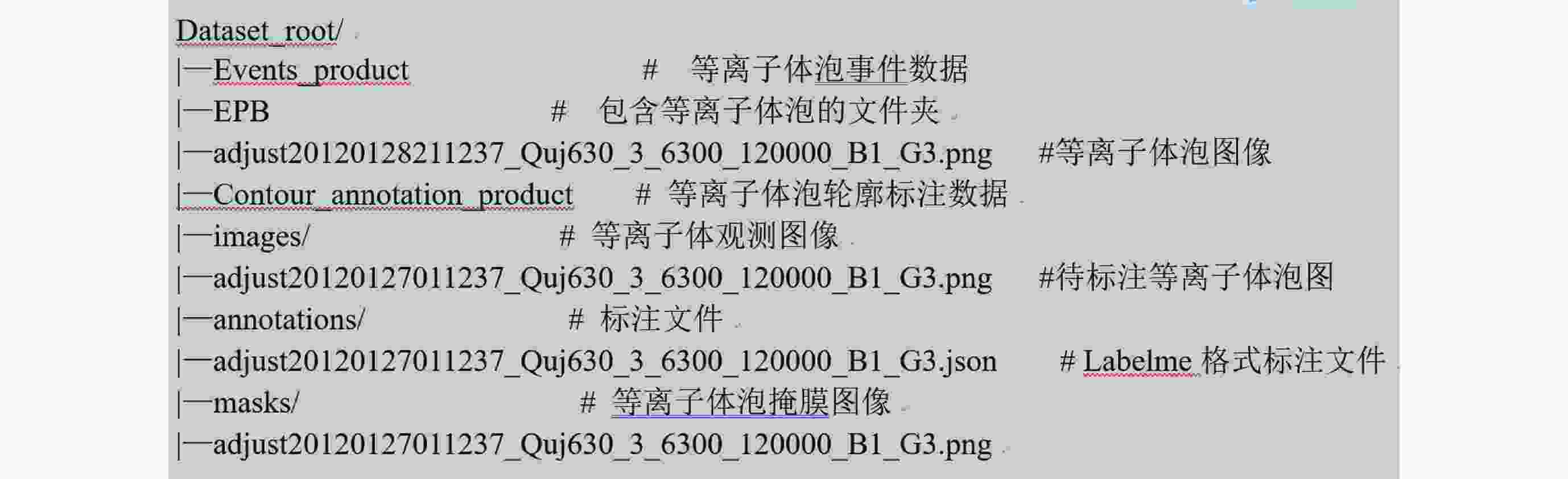 摘要: 研究构建了首个基于气辉观测的电离层等离子体泡标准数据集, 包含等离子体泡事件数据与精确轮廓标注数据. 该数据集源自云南曲靖站630 nm波段气辉成像仪历时一个完整太阳活动周(2012-2022年)的连续观测, 所有原始数据均经过图像增强、方位校正、几何畸变校正及地理坐标投影等标准化预处理, 并由专家团队完成等离子体泡事件识别及轮廓标注. 该数据集的时间分辨率高达3 min, 系统收录了不同太阳活动强度下的等离子体泡事件样本, 涵盖I形与Y形等多种典型形态. 本数据集为开发高精度监督式人工智能算法提供了高质量基准数据, 有助于促进基于气辉成像的电离层等离子体泡自动化检测与形态演化研究.Abstract: Airglow imaging observations, with their high spatiotemporal resolution and large-scale continuous monitoring capability, provide a crucial approach to studying the fine horizontal structures and evolutionary characteristics of ionospheric equatorial plasma bubbles. However, the current lack of high-quality, professionally annotated plasma bubble datasets severely restricts the application of supervised Artificial Intelligence (AI) algorithms in this field. To address this issue, this study constructs the first standardized dataset of ionospheric plasma bubbles based on airglow observations, including plasma bubble event data products and precise contour annotation data products. The dataset is derived from continuous observations over a full solar activity cycle (2012-2022) by a 630 nm band airglow imager at the Qujing Station in Yunnan, China. All raw data underwent standardized preprocessing, including image enhancement, azimuth correction, geometric distortion correction, and geographic coordinate projection. Expert teams then performed plasma bubble event identification and contour annotation. With a high temporal resolution of 3 minutes, the dataset systematically documents plasma bubble events under varying solar activity intensities, covering multiple typical morphologies such as shaped I- and Y-shaped structures. This dataset provides high-quality benchmark data for developing high-precision supervised AI algorithms, facilitating automated detection and morphological evolution research of ionospheric plasma bubbles based on airglow imaging.