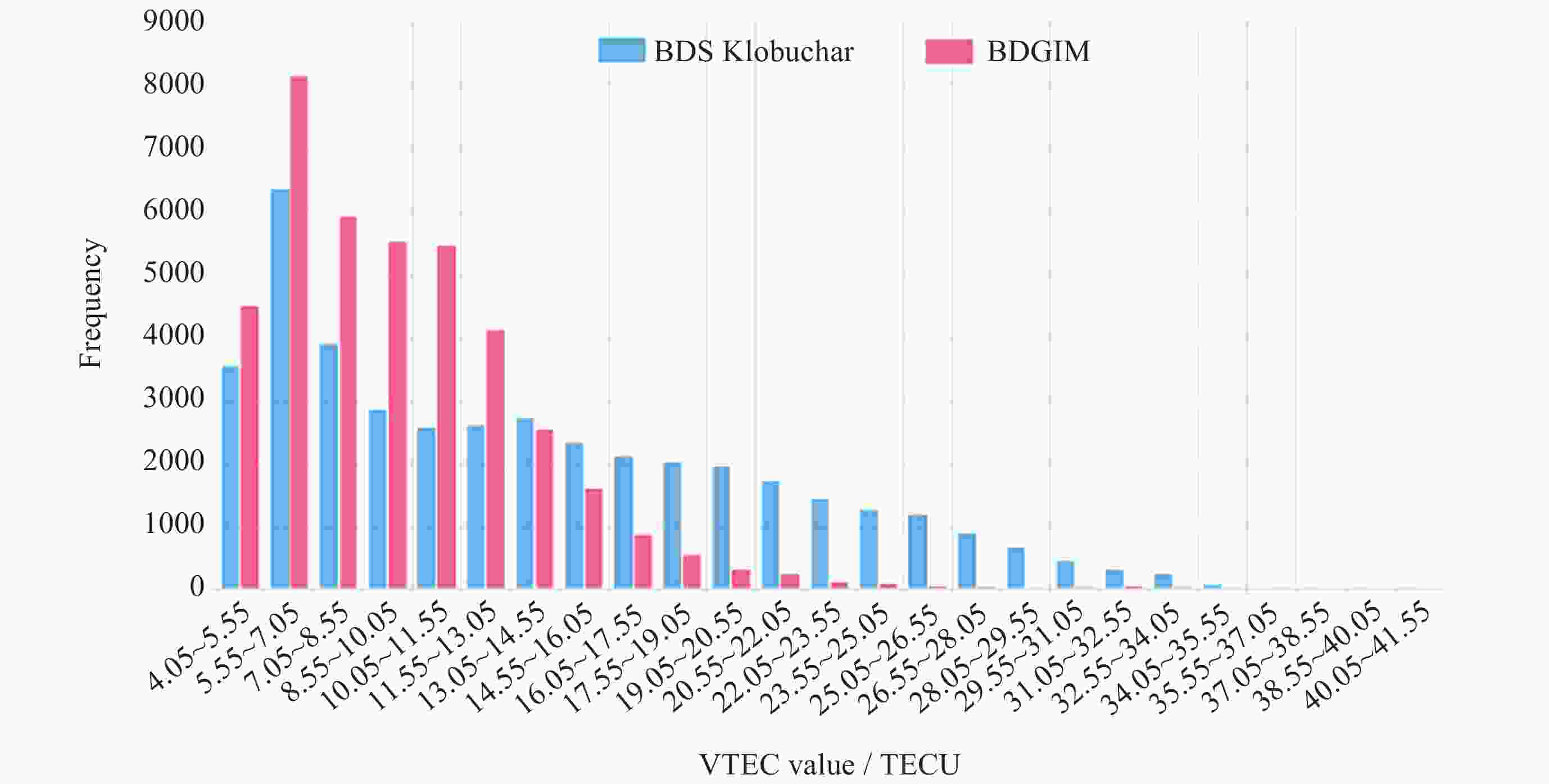 Year BDS Klobuchar/TECU BDGIM/TECU mean max min mean max min 2020 7.359 35.440 4.350 3.193 6.240 1.570 2021 7.420 34.940 3.690 3.545 16.900 1.660 2022 11.096 36.140 4.350 5.923 32.870 2.290 2023 16.626 40.150 6.420 9.337 33.740 3.520 2024 21.039 41.630 7.940 12.025 41.560 6.050 2025 22.211 34.500 10.400 11.481 35.330 6.640 表 5 以iGMAS产品为基准的2020-2025年BDS Klobuchar和BDGIM模型VTEC平均、最大、最小RMS
