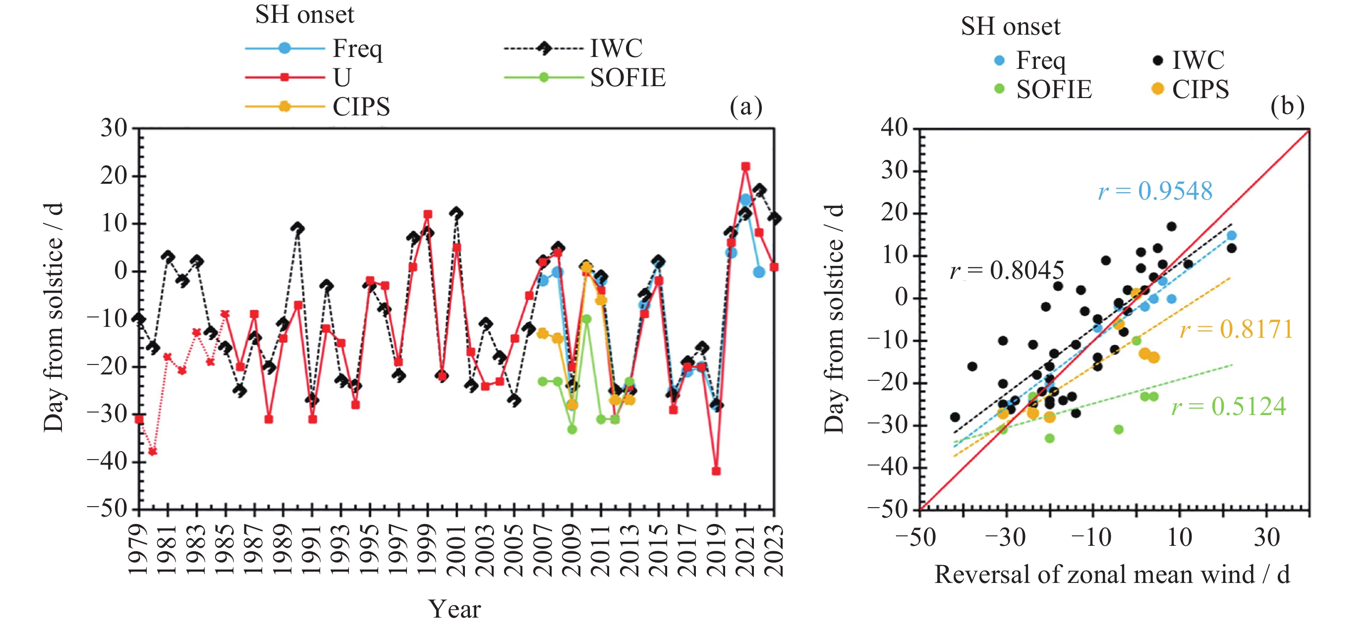 Figure  2.  Correlation between the onset of PMC seasons and the zonal mean wind in the Southern Hemisphere (SH). (a) The interannual variation between the onset of PMC seasons and the reversal time of zonal mean wind, (b) the correlation between them