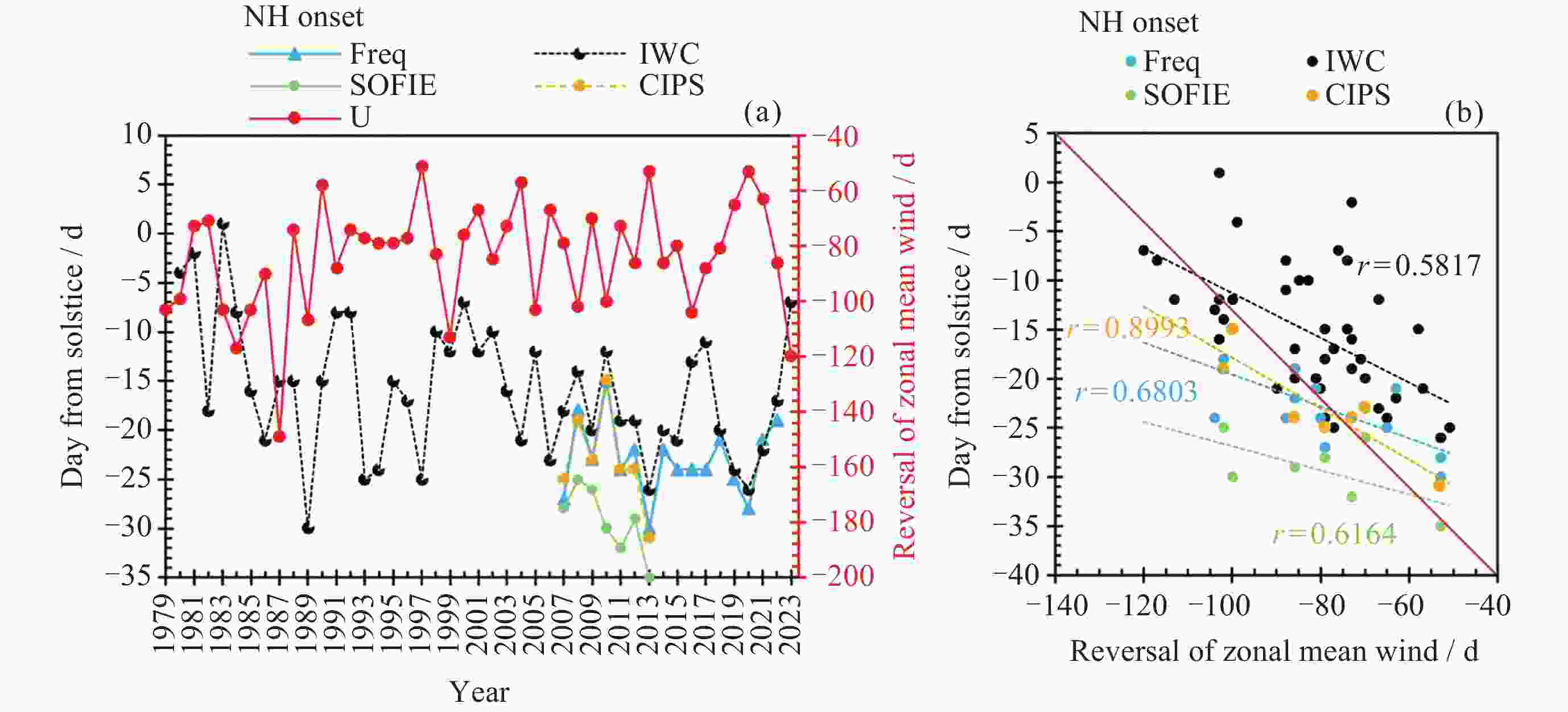 图  3  1979-2023年北半球夜光云季起始时间与纬向平均风的相关性. (a) 季节起始时间与纬向平均风反转时间的年际变化, (b) 表示季节起始时间与纬向平均风反转时间的相关性
