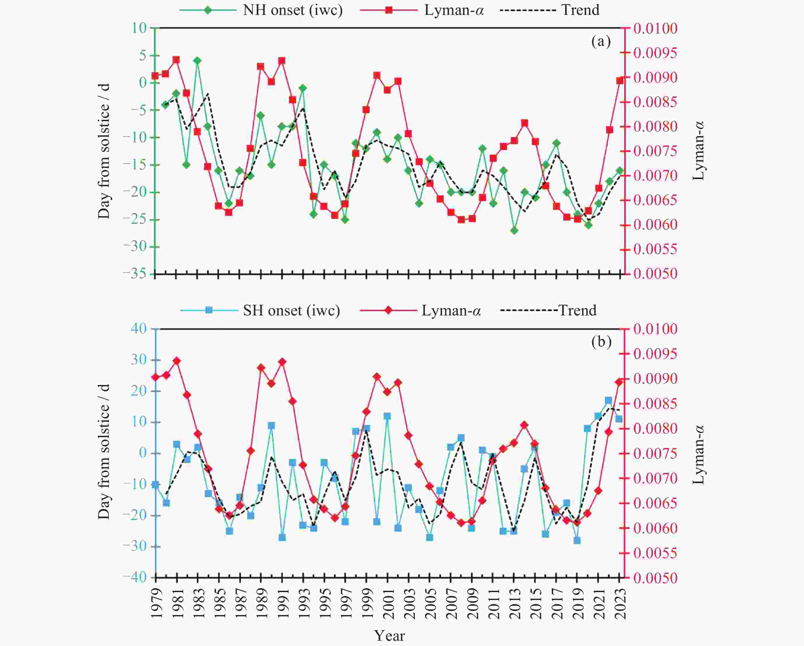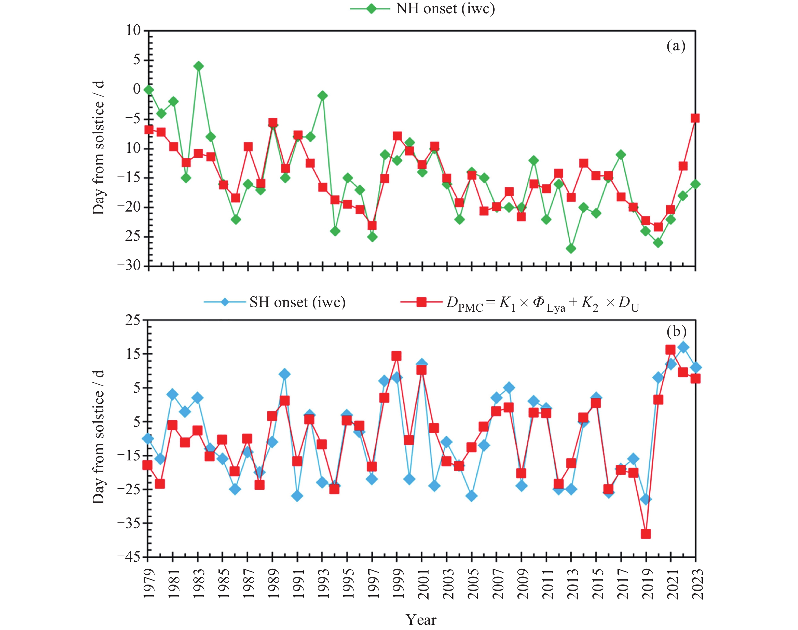 Figure  1.  Onset of PMC seasons from 1979 to 2023 in both northern and southern hemispheres respectively
