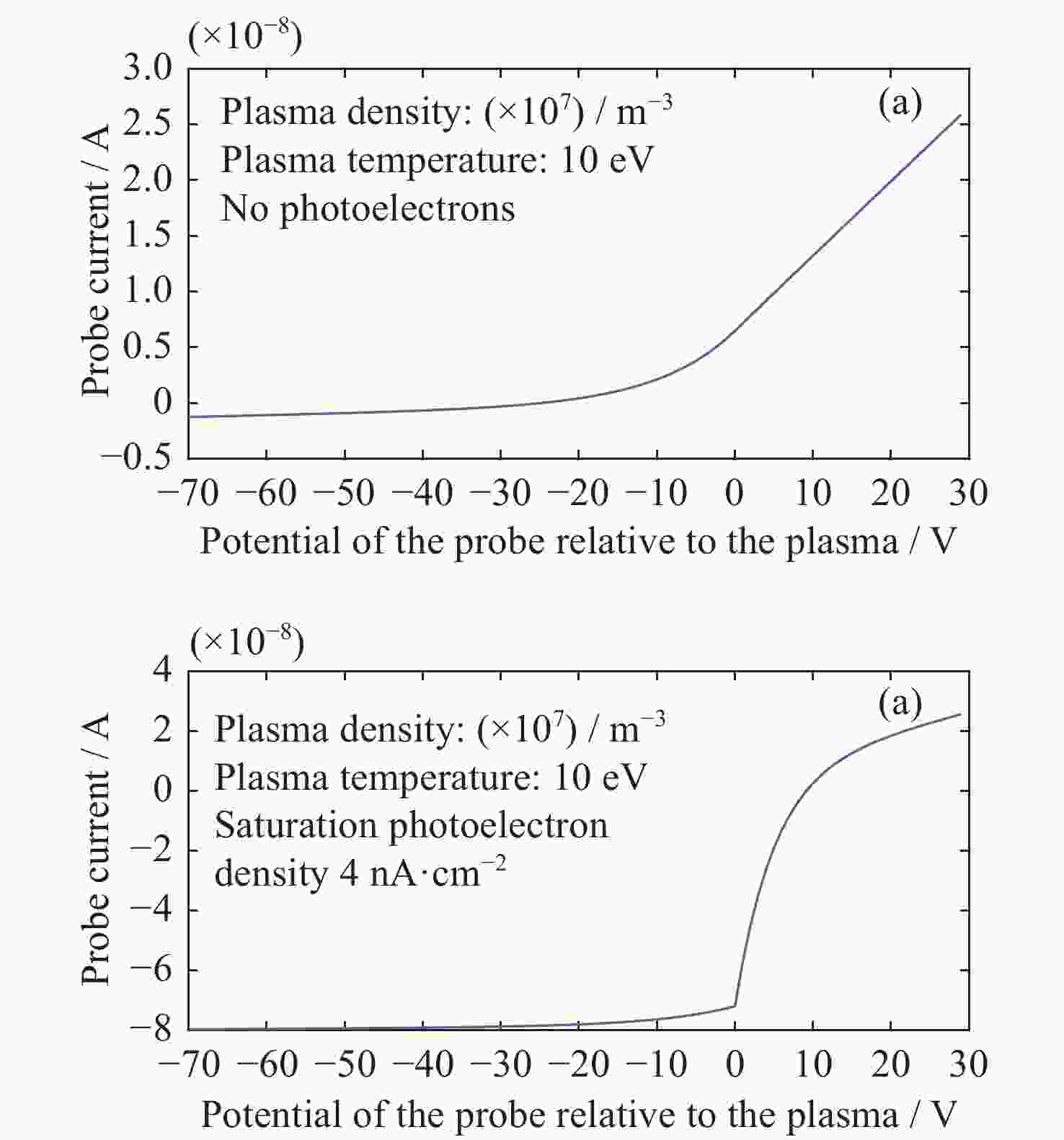• 图  1  月表等离子体V-I曲线仿真. (a)不考虑光照条件, (b)考虑光电流