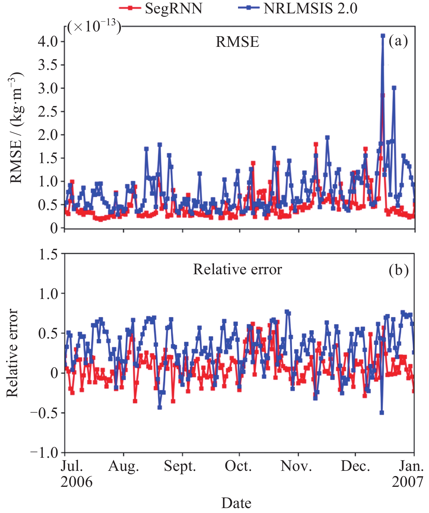 大气阻力是低轨卫星受到的最大非引力摄动, 大气阻力的计算误差主要来源于热层大气密度经验模型误差, 目前经验模型的误差较大, 普遍在30%以上. 为提高经验模型的预报精度, 提出一种基于SegRNN(Segment Recurrent Neural Network)的热层大气密度经验模型校准方法. 该方法使用SegRNN的分块和并行策略进行模型训练和推理, 避免了传统RNN(Recurrent Neural Network)因迭代次数过多而引起误差累积与梯度不稳定的问题. 通过分析大气密度与Ap, F10.7和F10.7a外部环境参数的变化关系, 提出了一种改进的神经网络架构SegRNN with Residual Block. 该架构通过引入外部环境参数作为动态协变量(Covariates), 使用Residual Block(RB)提取预报时段的密度相关信息, 从而进一步提高SegRNN的预报精度. 利用GRACE(Gravity Recovery and Climate Experiment)星载加速度计反演得到的密度数据对NRLMSISE 2.0进行校准实验. 结果表明, NRLMSIS 2.0模型原始误差为31.3%, 经SegRNN校准后, 误差降低至8.0%, 引入动态协变量后, 模型误差进一步降低至7.2%, 最终校准模型误差下降了24.1%, 校准效果显著.