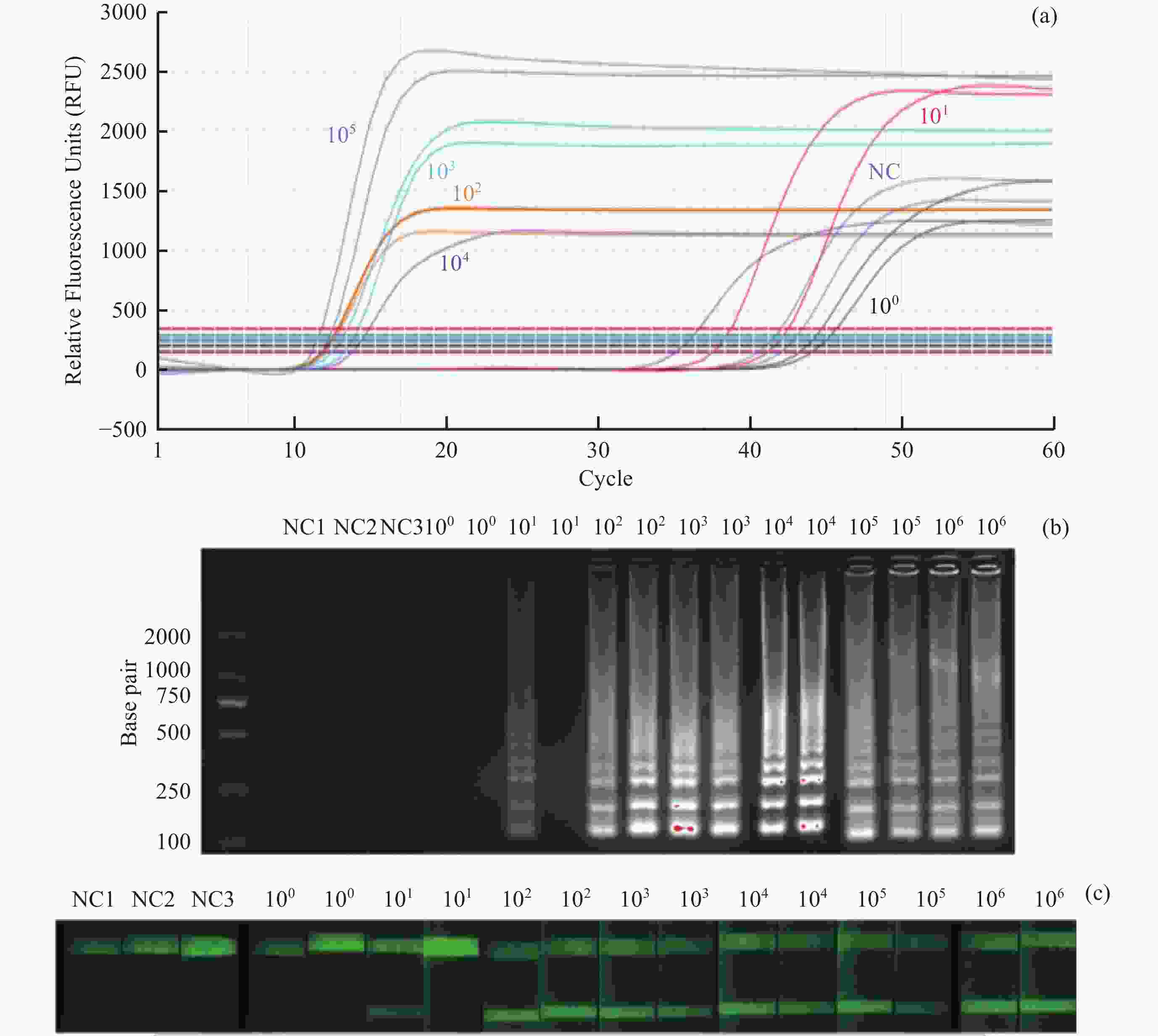 Figure  2.  LAMP amplification curves of samples with different concentrations after coupling (a); Gel electrophoresis imaging of LAMP amplification products of samples with different concentrations after coupling (b); Test strip loading of LAMP amplification products of samples with different concentrations after coupling, fluorescence imaging results after excitation at 470 nm (c)