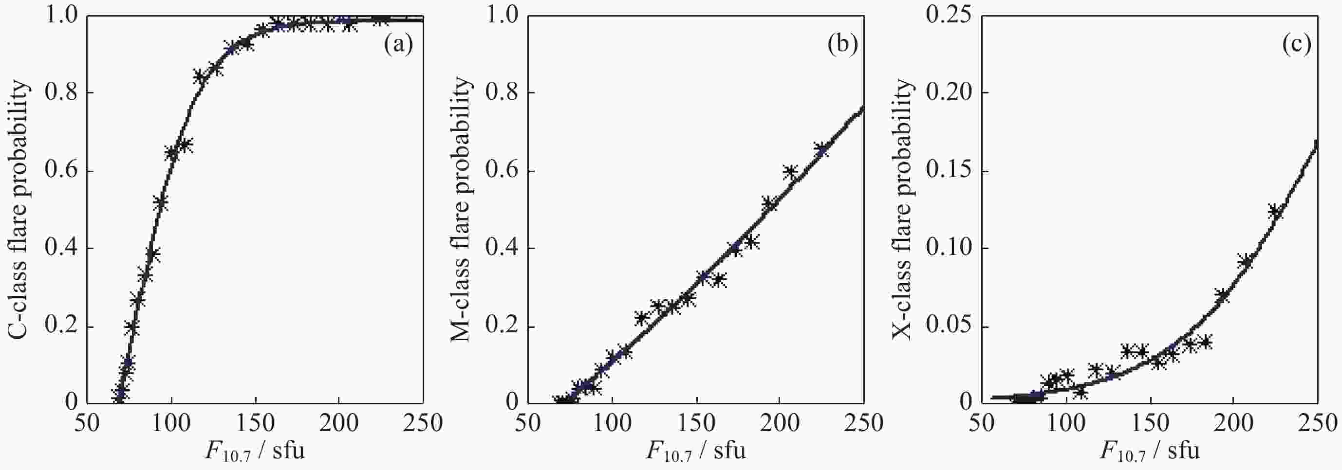 Table 1. Boltzmann function coefficients for fitting F10.7 to the production frequencies of C, M, and X-class flare, respectively