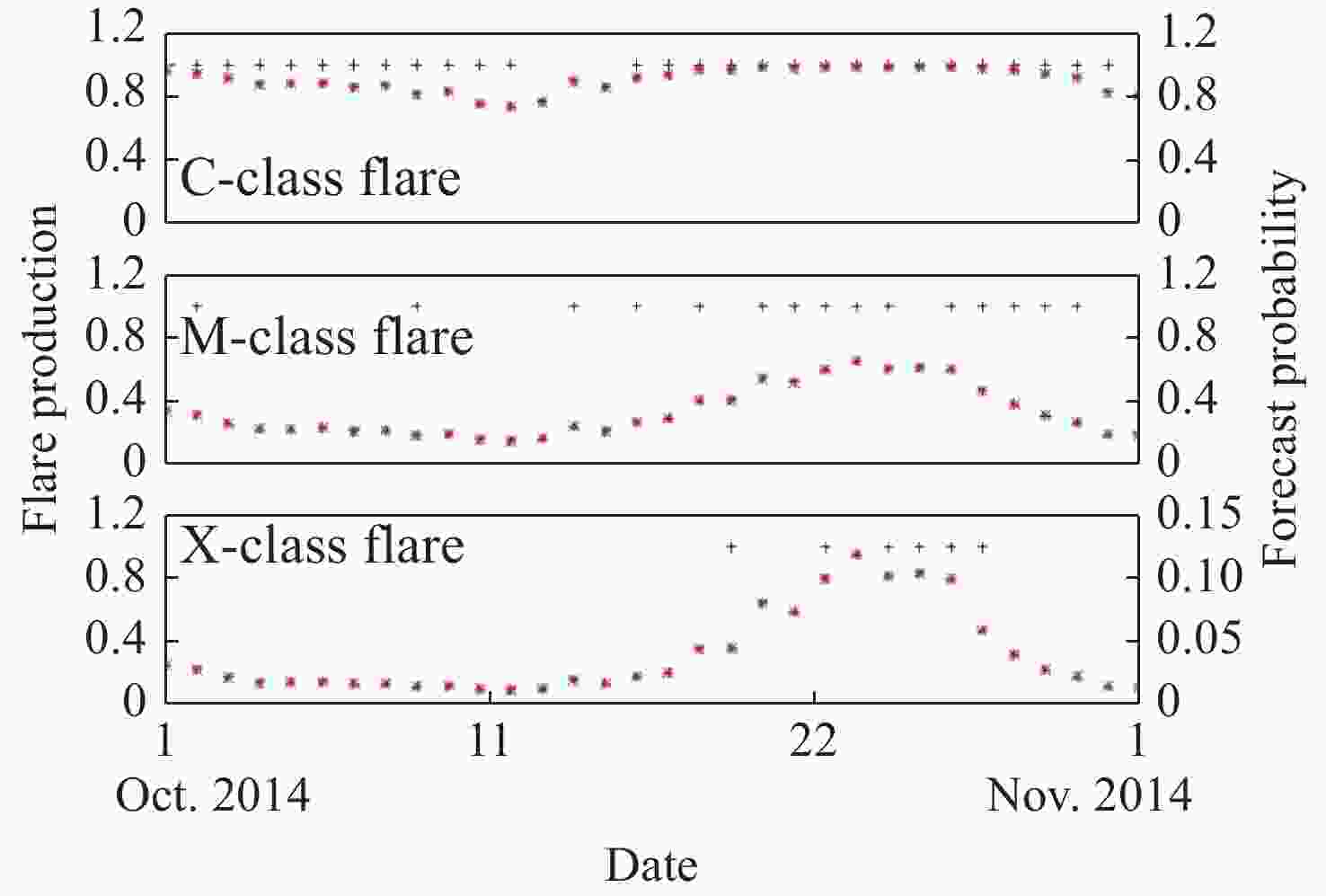 图 3 2014年10月全日面耀斑预报模型的预报结果与实测结果的比较 (红色散点为预报值,蓝色散点为耀斑实际发生情况)