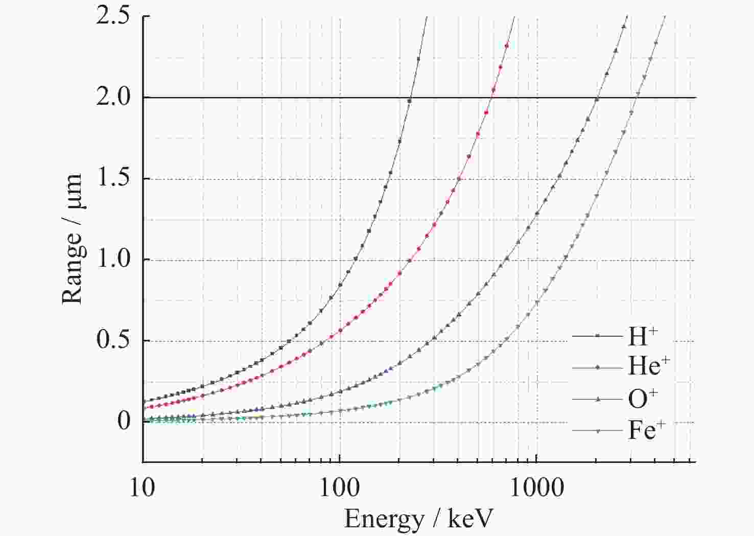 图  18  H+,He+,O+和Fe+在铝材料中的射程