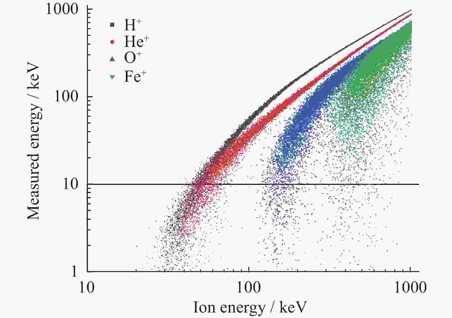 图  9  H+,He+,O+和Fe+离子测量能量仿真计算结果