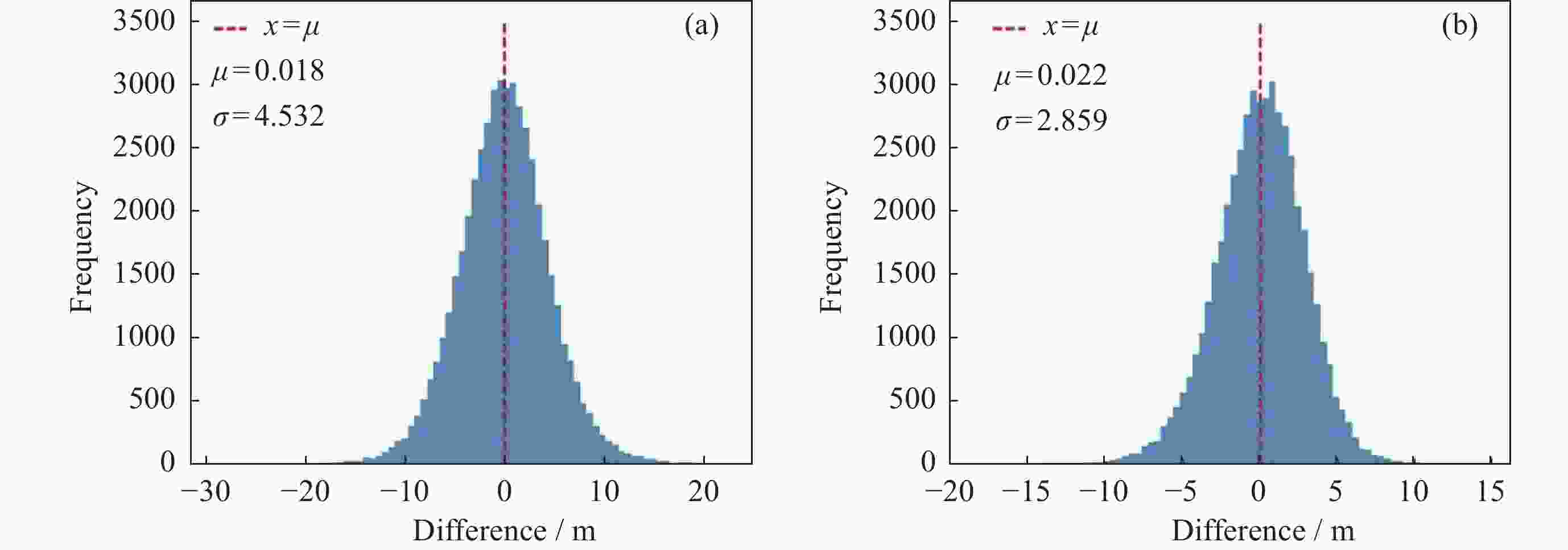 图  11  估算冠层高度与真实冠层高度差值直方图 (ICESat-2估算的冠层高度减去根据辅助影像估算的冠层高度)。(a)最大冠层高度直方图, (b)平均冠层高度直方图。$ \mu $和$ \sigma $分别表示差异的平均值和标准差