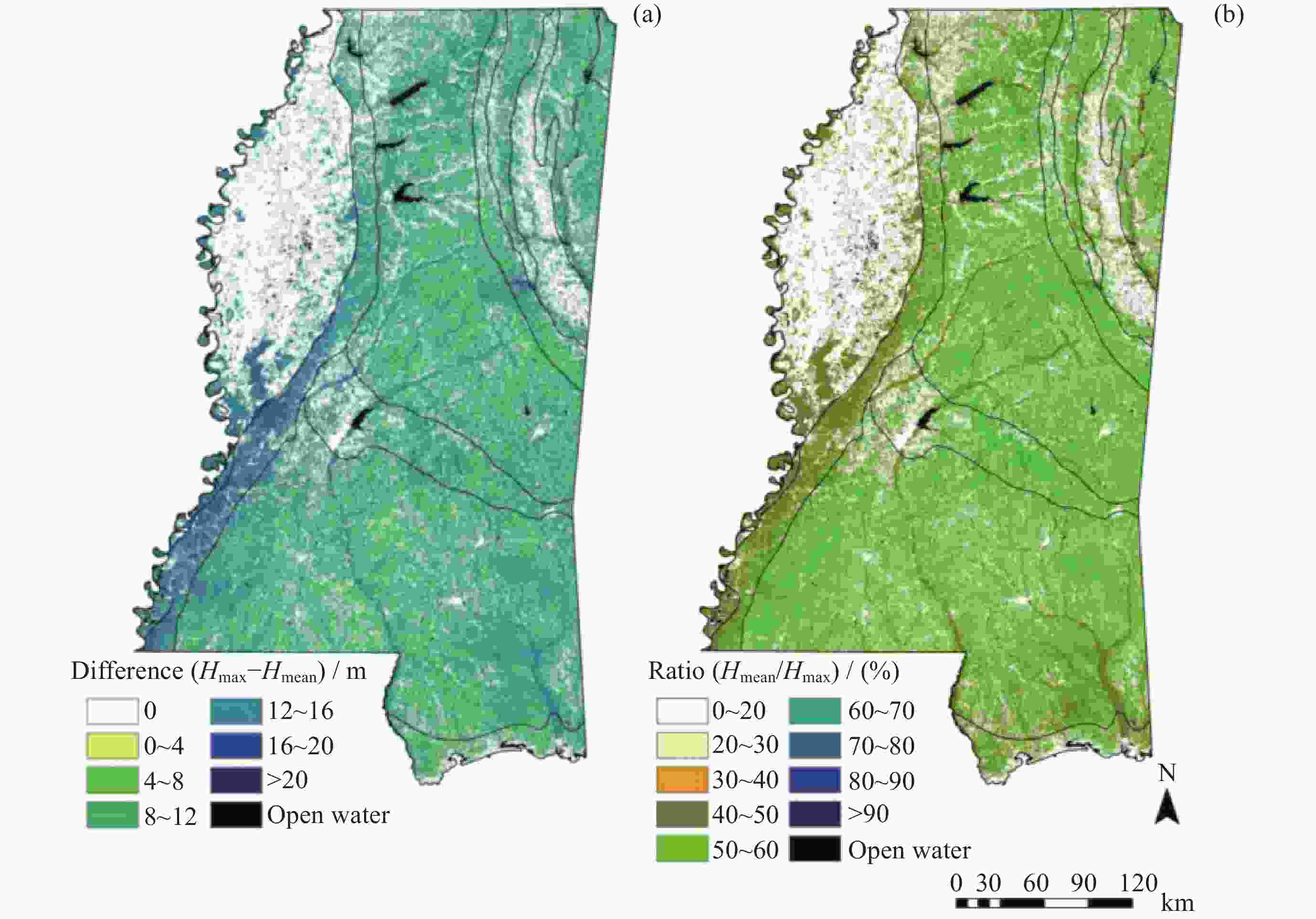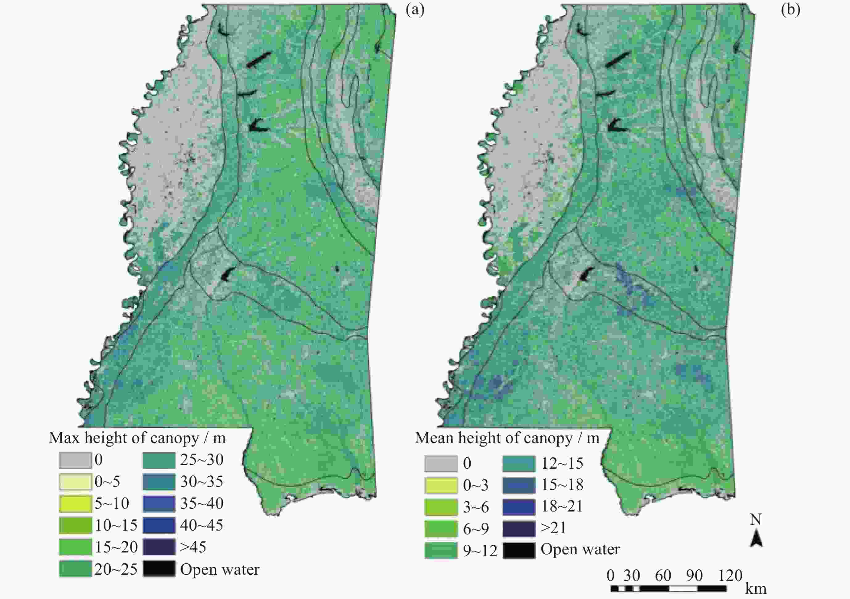图  12  冠层最大高度与冠层平均高度在密西西比州的分布