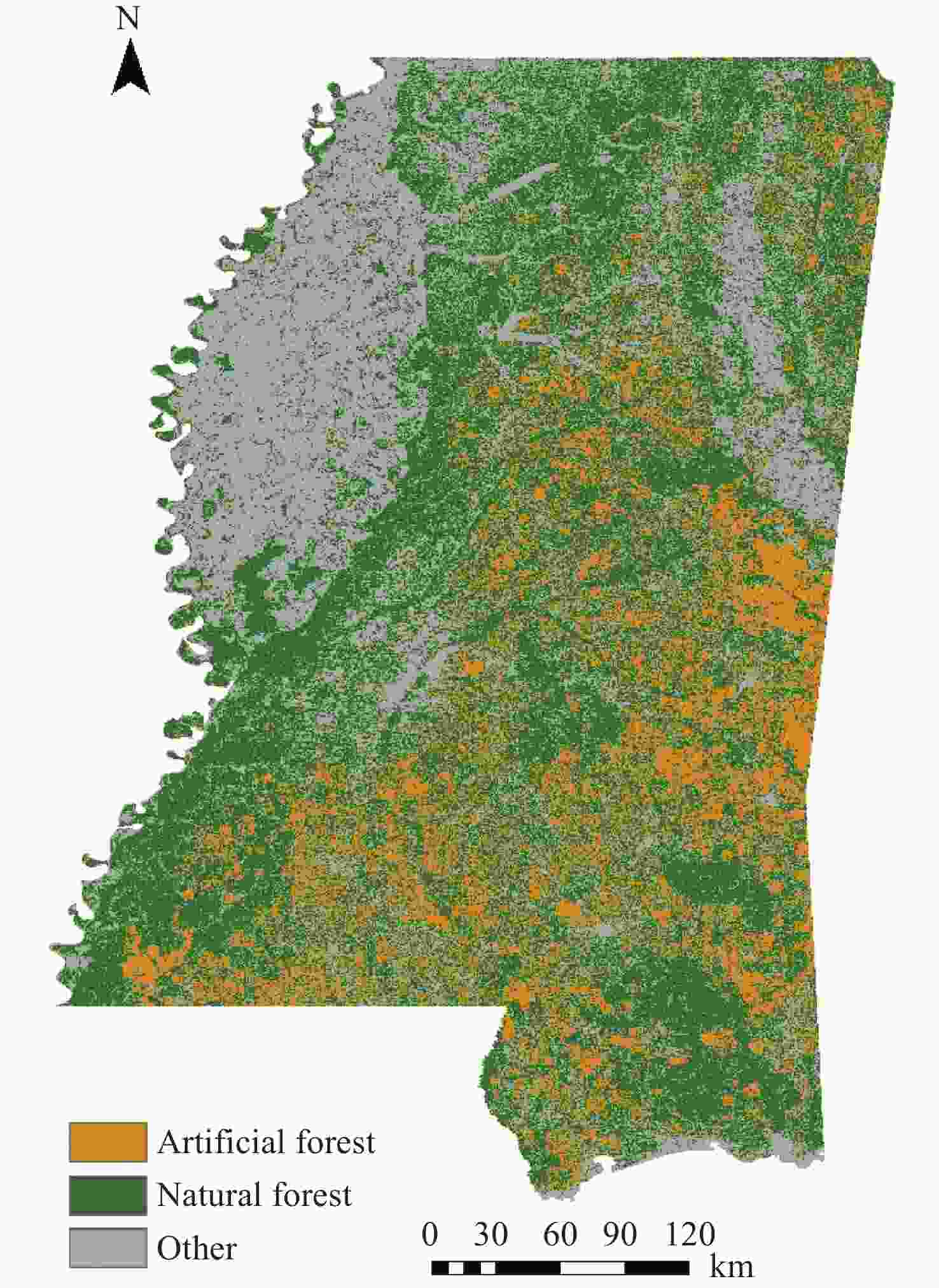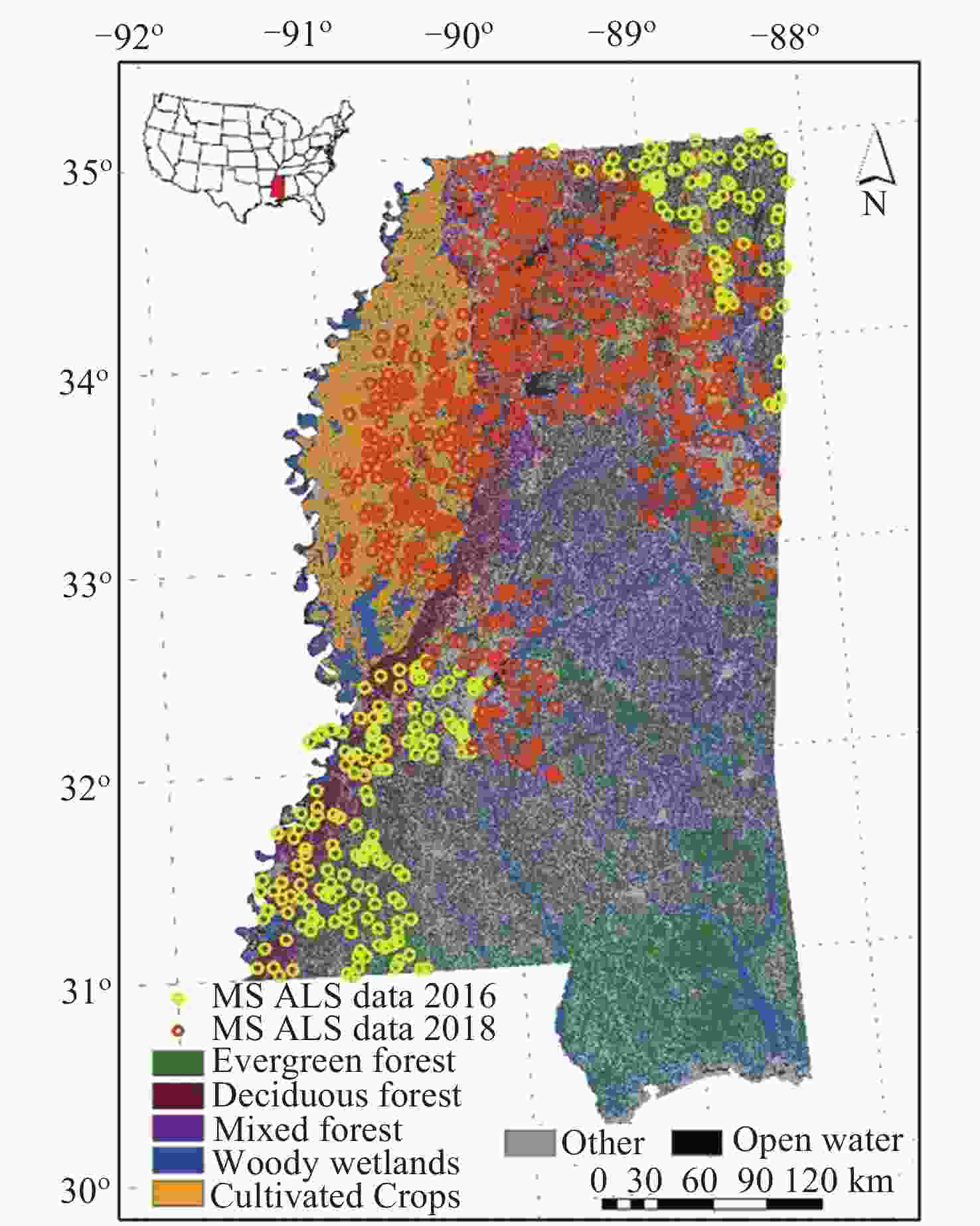 • 图  1  密西西比州土地覆盖类型与机载激光雷达数据(ALS)样地分布(2016-2018年)