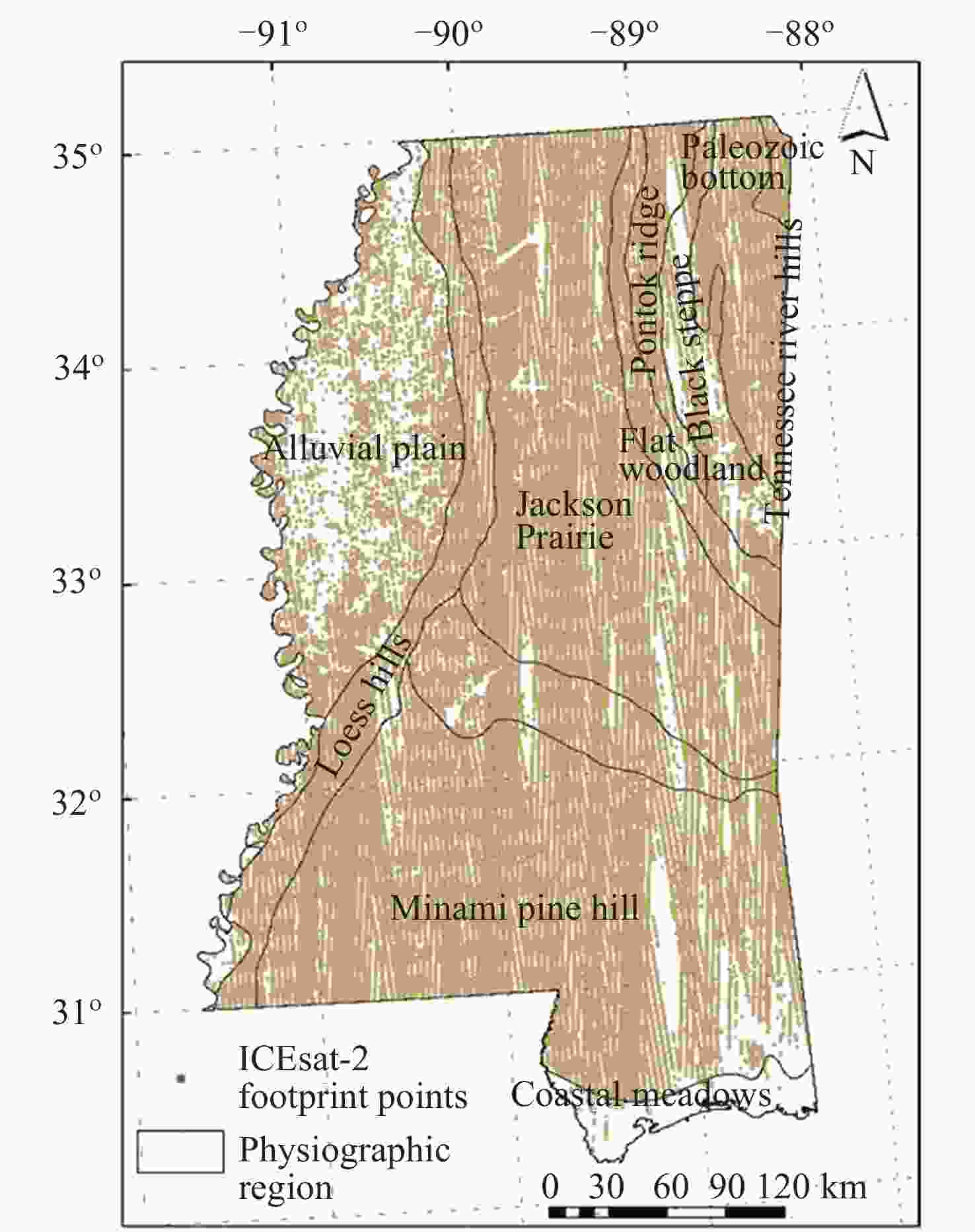 图  2  密西西比州地理区域和ICESat-2星载激光雷达数据足迹点分布(2018-2022)