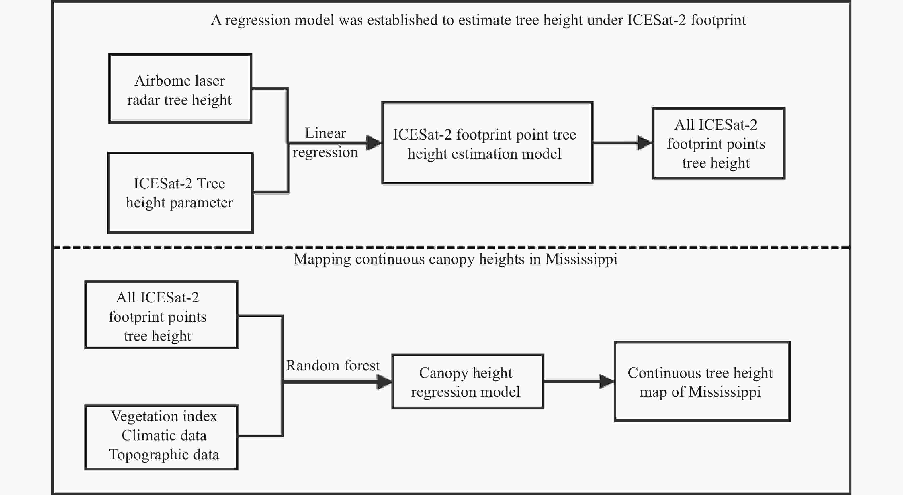• 摘要: 为了大范围精确估计空间连续的森林冠层高度,研究使用随机森林回归方法,通过融合冰、云和陆地高程卫星二号 (Ice, Cloud and land Elevation Satellite-2, ICESat-2)测量数据和Landsat-8影像,并结合地形、气温等数据来估算森林冠层高度,生成2020年美国密西西比州30 m空间分辨率的森林冠层最大高度和平均高度图。结果表明,森林覆盖区域冠层最大高度的均值为24.14 m,标准差为4.24 m。森林覆盖区域冠层平均高度的均值为12.04 m,标准差为2.59 m。研究区冠层高度估计值与机载测量值吻合良好(冠层最大高度R2 = 0.486,$ {H}_{\mathrm{R}\mathrm{M}\mathrm{S}\mathrm{E}} $ = 4.532 m;冠层平均高度R2 = 0.467,$ {H}_{\mathrm{R}\mathrm{M}\mathrm{S}\mathrm{E}} $ = 2.848 m)。利用估算数据进一步对森林冠层垂直结构复杂度进行了分析。研究提出的森林冠层高度制图方案对中国长江三角洲地区的森林管理、物种多样性保护与碳中和评估等具有指导意义。