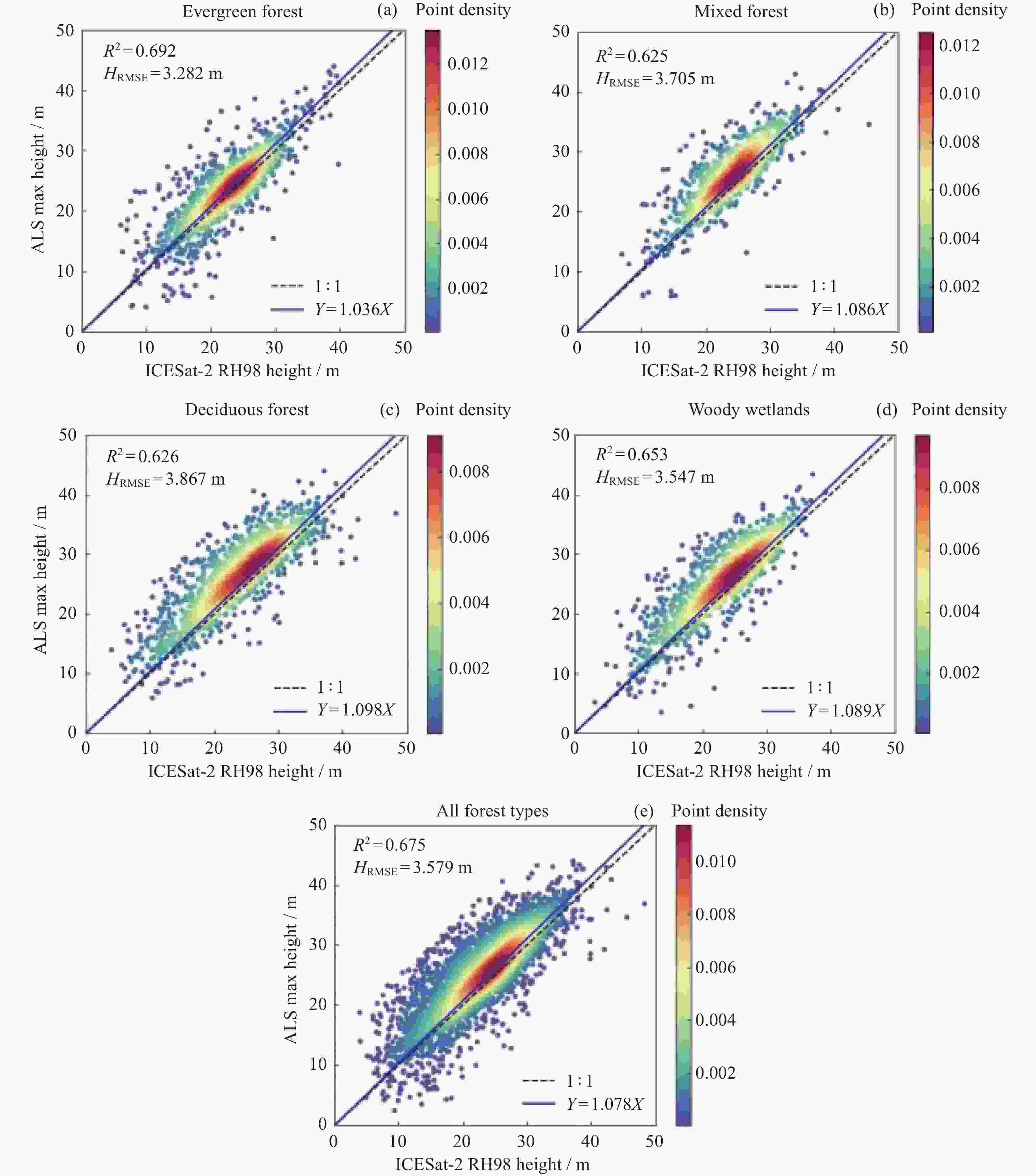 图  6  ICESat-2 不同森林类型冠层最大高度建模散点图和拟合线