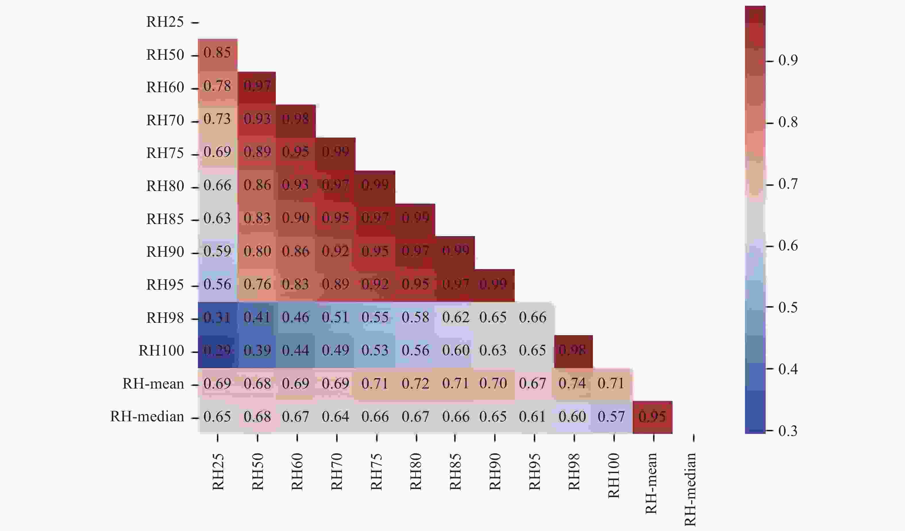 图  8  星载激光雷达数据各变量之间相关性(RH25-100表示相对高度的百分位数,RH-mean和RH-median分别表示相对高度的平均值和中值。色条表示变量之间的相关性,数值越大表示变量越相关)