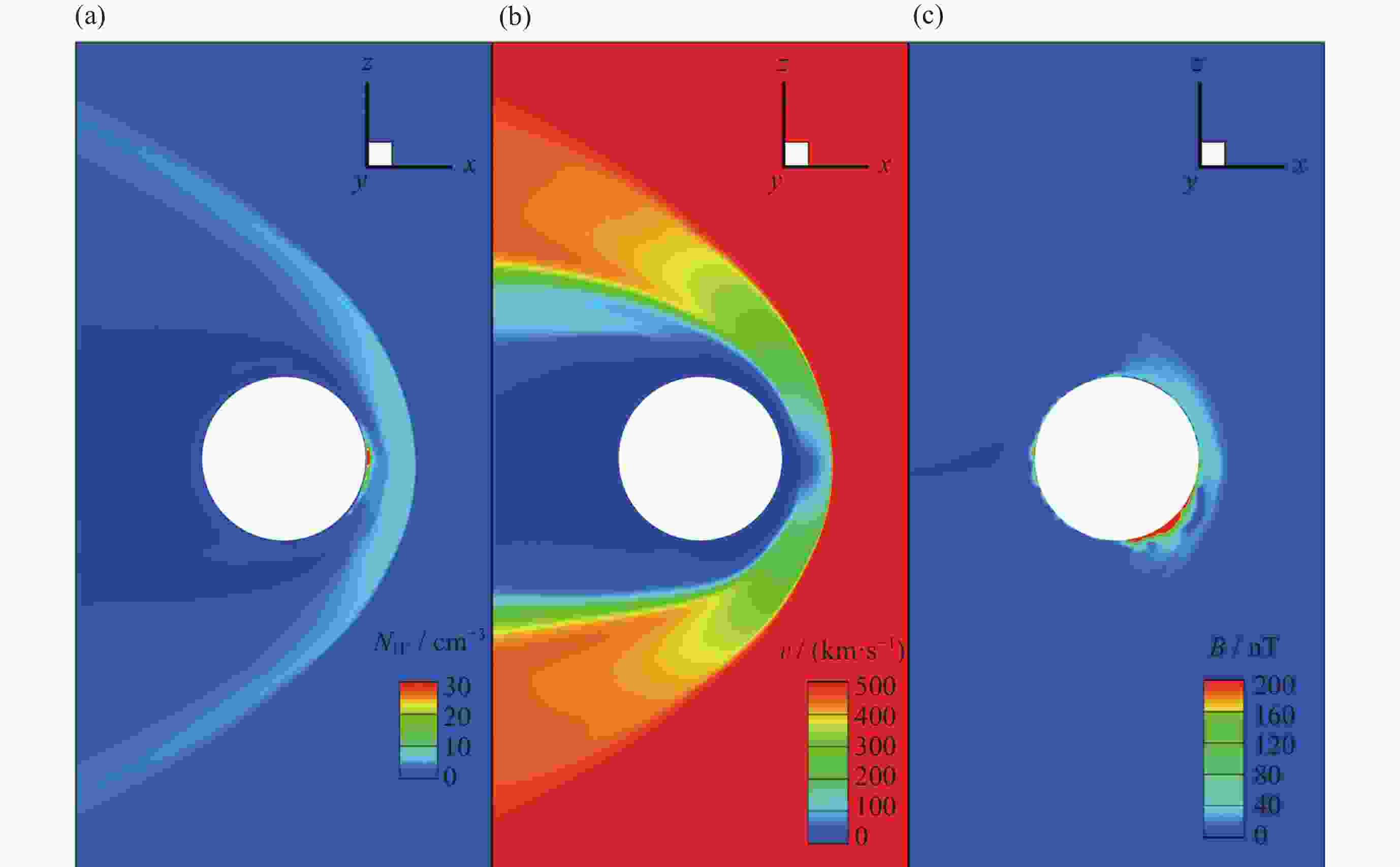 太阳风参数 值 密度/cm–3 1.8 速度/(km·s–1) (500, 0, 0) 质子温度/K 1.5×105 磁场/nT (–1.6, 2.5, 0) 表 2 临界高度170 km处外逸层模型参数