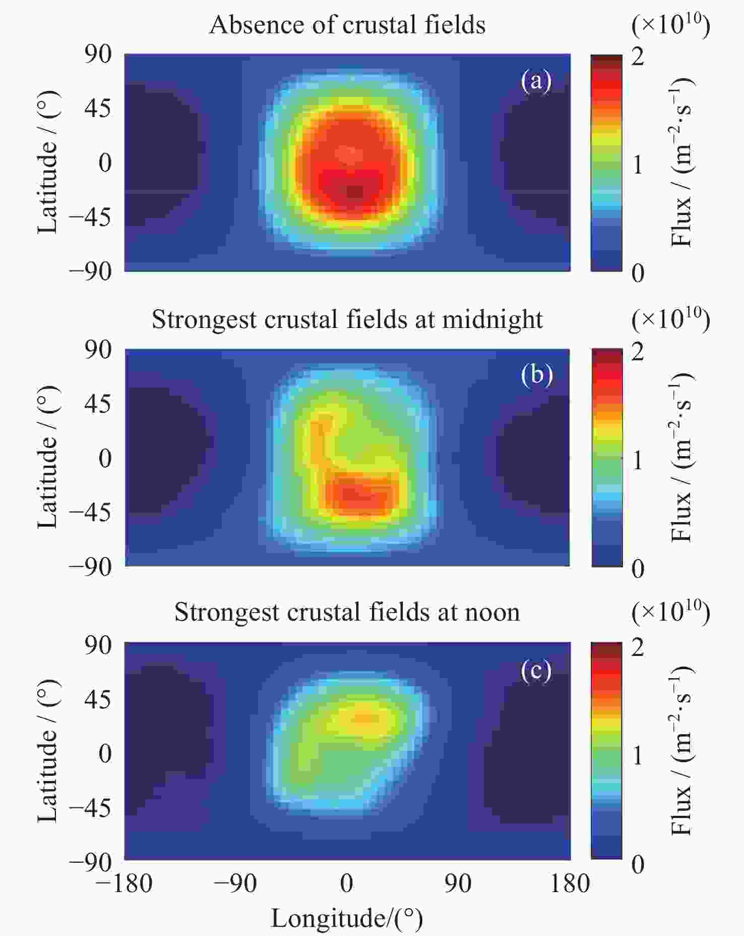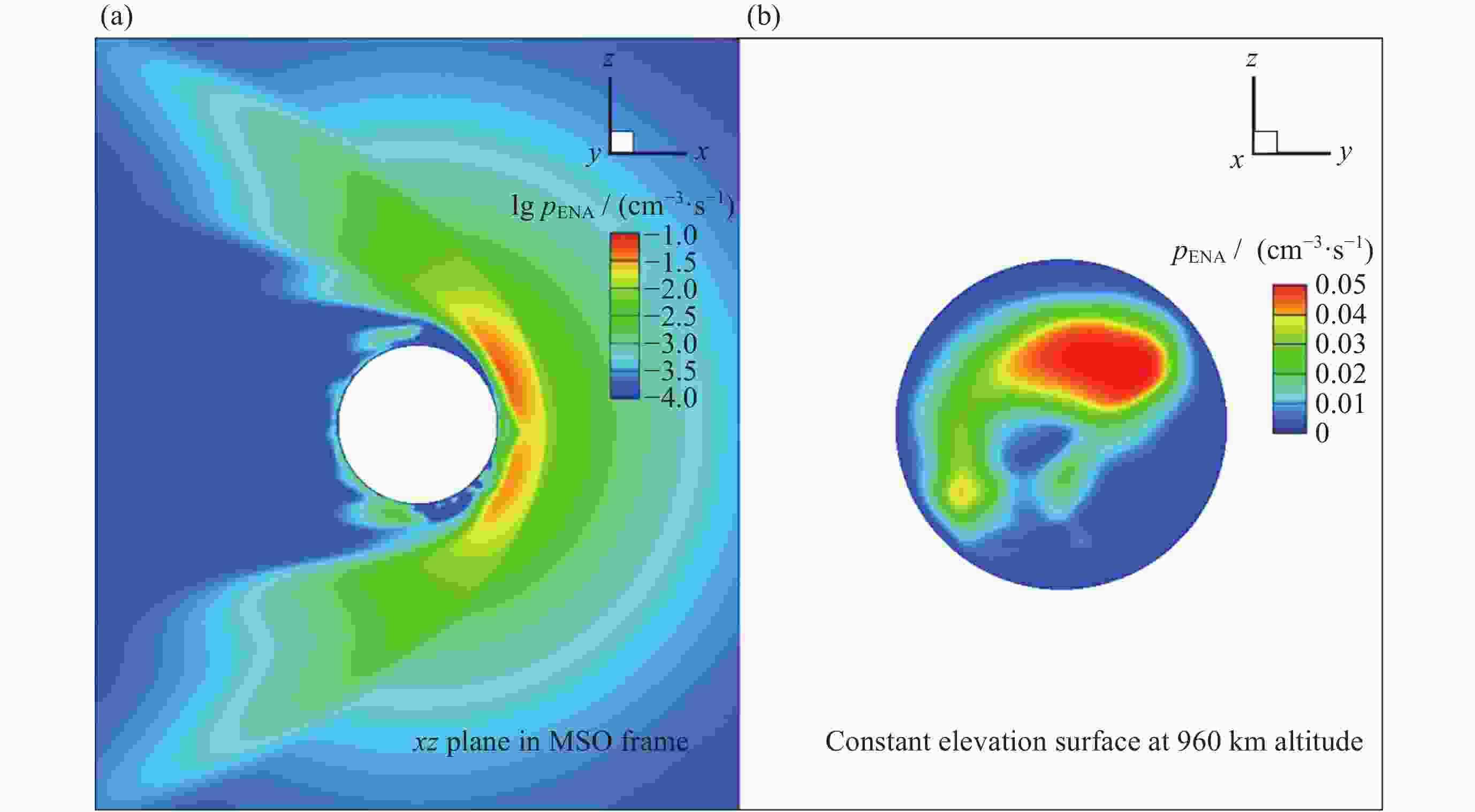 摘要: 能量中性原子(Energetic Neutral Atom, ENA)是由能量离子与中性背景成分电荷交换产生. 火星的外逸层扩展范围远高于弓激波, 上游太阳风质子与其相互作用并转化为太阳风氢ENA(Hydrogen-ENA, H-ENA), 新生的H-ENA可直接进入低层大气, 成为新的物质与能量输运通道. 本文基于单流体多成分MHD模型与中性外逸层模型, 计算了火星200 km等高面沉降H-ENA通量的空间分布, 统计了多种太阳风条件下沉降H-ENA的粒子与能量沉降率, 分析影响因素. 结果表明, 在一定模拟条件下, 产生于弓激波上游的太阳风H-ENA, 呈cosZ分布(Z为天顶角), 受磁异常影响较小, 是沉降H-ENA的主要成分, 占ENA总沉降量的59%, 占能量沉降的81%; 产生于磁鞘的磁鞘H-ENA受磁异常阻碍影响较大, 在最强磁异常上方其沉降通量显著下降; 沉降H-ENA与上游太阳风的通量呈正比例关系; 2.1%~3.5%上游太阳风质子转化为太阳风H-ENA.Abstract: Energetic Neutral Atom (ENA) is generated by charge exchange between energetic ions and background neutrals. As Martian exosphere extends far above the bow shock, hydrogen ENA (H-ENA) produced by solar wind proton may enter the lower atmosphere directly, depositing mass and energy in the atmosphere. Based on the single-fluid multispecies MHD model and exosphere model, this paper calculates the spatial distribution of the precipitating H-ENA flux at the height of 200 km on Mars, evaluates the particle and energy deposition rate of the precipitating H-ENA under different solar wind conditions, analyzes their controlling factors. The results show that the solar wind H-ENA generated upstream of the bow shock is less affected by the crustal fields, and shows a cosZ distribution. As a major mass and energy source, the precipitating solar wind H-ENAs account for 59% particle deposition and 81% energy deposition of the total precipitating ENAs. Magnetosheath H-ENA generated in the magnetosheath is greatly affected by the crustal fields, and their precipitating flux decreases significantly above the strongest magnetic anomalies. The precipitating H-ENA flux is proportional to the upstream solar wind flux, and 2.1%~3.5% of upstream solar wind protons are estimated to be converted into the solar wind H-ENAs.