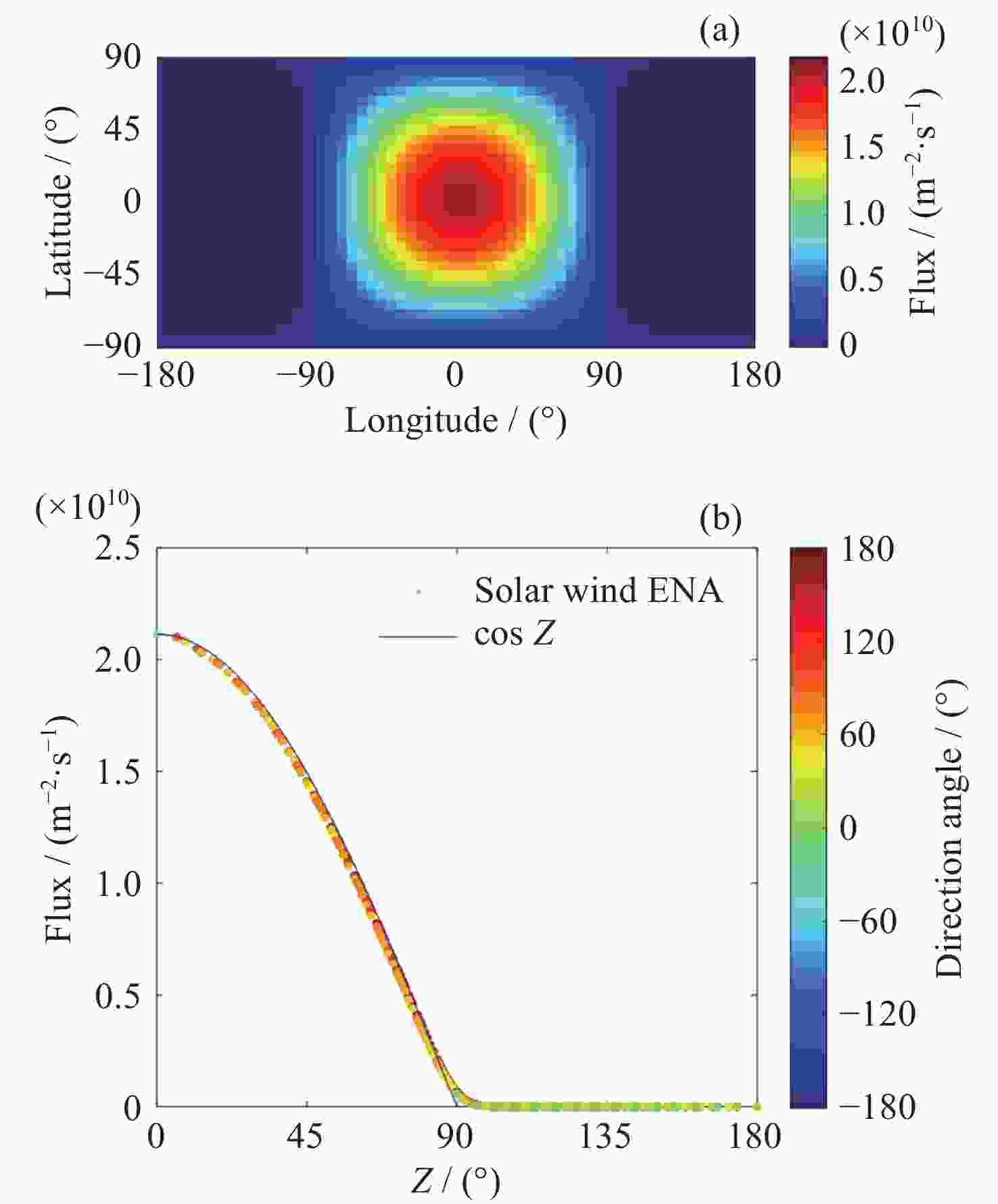 图 4 200 km等高面上沉降太阳风H-ENA通量的空间分布. (a)沉降太阳风H-ENA通量的经纬度分布, (0, 0)表示日下点. (b)沉降太阳风H-ENA通量随太阳天顶角(Z)的变化