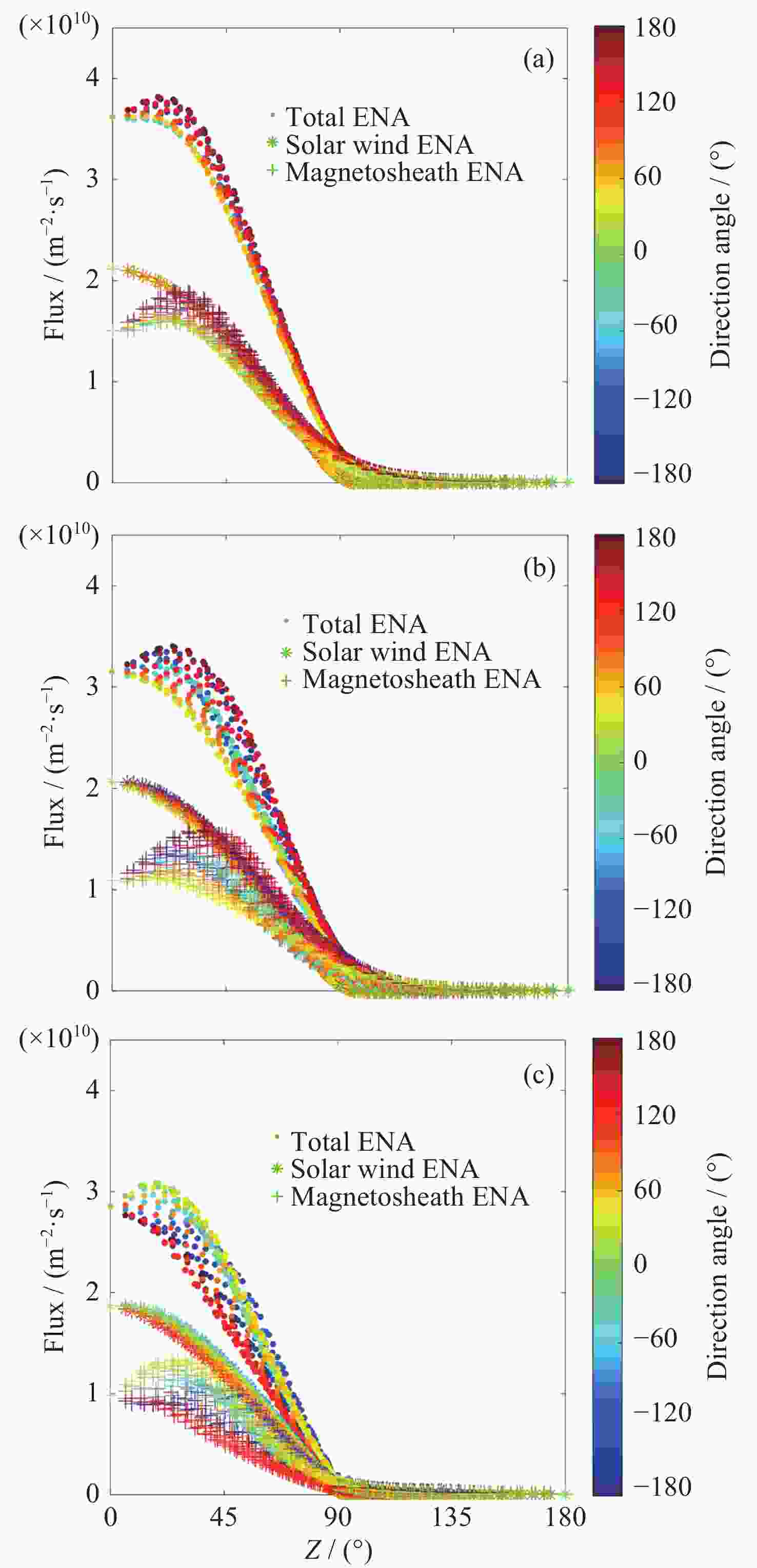 Figure 6. Variation of precipitating H-ENA flux on 200 km constant elevation surface with solar zenith angle Z (Direction angle is from the connection arc between the precipitating position and subsolar point to the geography north of the subsolar point)