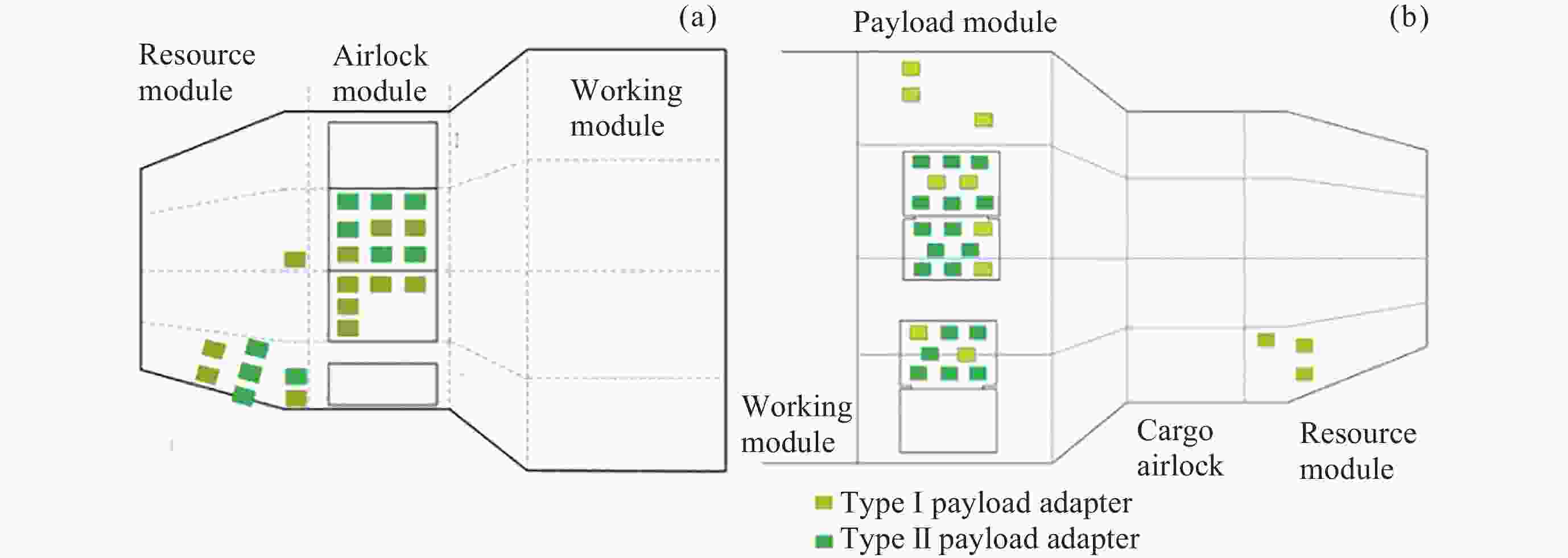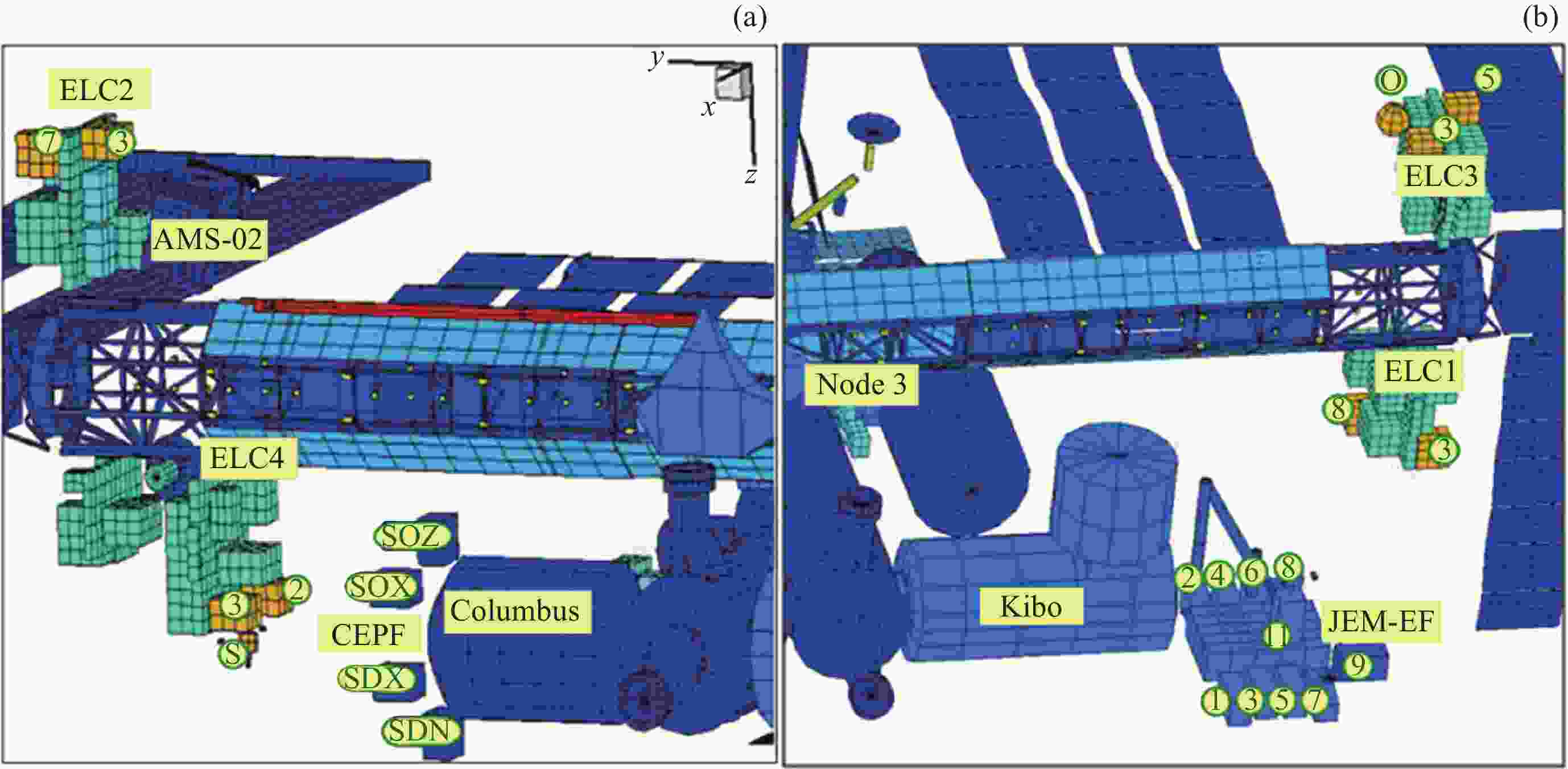 类型 ELC JEM-EF CEPF 入轨时间(年) 2009-2011 2008 2008 容积/m3 1.2 1.5 1.2 承重质量/kg 227 550/2 250 230 电能/kW 0.75 3/6 2.5 热控方式 被动热控 主动热控 被动热控 通信容量/(Mbit·s–1) 1~6 100 1/2 美国共享数/总工位数 8/8 5/10 2/4 平台位置 桁架P3/ S3上下 希望号舱左舷 哥伦布号舱右舷 表 2 美国舱段舱外载荷信息