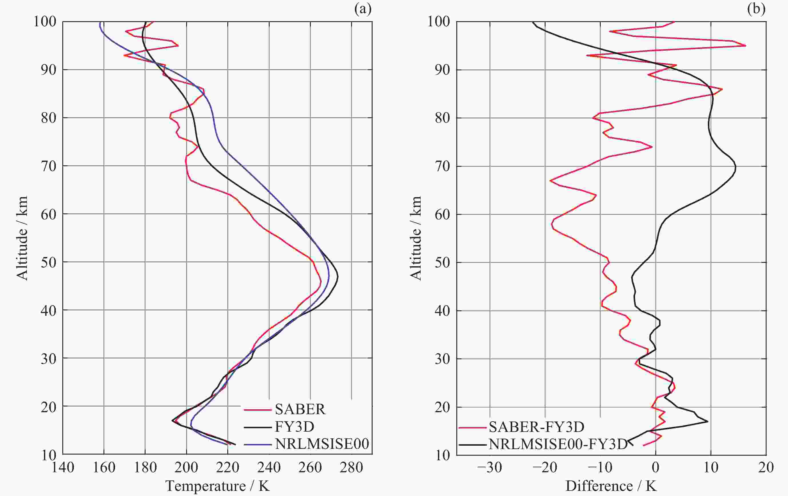 摘要: 大气温度数据的精确探测对于研究中高层大气的结构特征和动力学过程具有重要意义. 利用2019年1月至2021年12月共3年的FY3D掩星观测数据, 借助TIMED/SABER探测数据和NRLMSISE00大气模式数据, 对12~100 km范围内的大气温度数据进行比较. 统计分析SABER-FY3D温度偏差(TSABER–TFY3D)和NRLMSISE00-FY3D温度偏差(TNRLMSISE00–TFY3D)及其随纬度、季节的分布和南北半球的差异. 结果显示, 三种温度数据随高度变化趋势是大体一致的, SABER-FY3D温度偏差在12~30 km高度范围内为正偏差(0~1.8 K), 随高度升高, 温度偏差从30 km处的0 K增加到77 km处的$ - $11.6 K. NRLMSISE00-FY3D温度偏差在平流层为正偏差(0~4.4 K), 在中间层和低热层为负偏差($ - $2~0 K). 两种温度偏差随纬度和季节都存在明显的变化特征. 60 km以下, SABER-FY3D温度偏差在低纬地区较小($ - $3.8~1.8 K), 高纬地区较大($ - $12~1.6 K), 夏季较小($ - $0.5~2.2 K), 冬季较大($ - $6.2~1 K); NRLMSISE00-FY3D温度偏差正好相反, 在高纬地区较小($ - $1.6~2.4 K), 低纬地区较大($ - $3.9~6.1 K), 冬季较小($ - $2~2.2 K), 夏季较大($ - $1.3~7.1 K). 两类月平均温度偏差的零偏差线所在高度在南北半球均存在春夏季节较高, 秋冬季节较低的特征. 冬季40~60 km高度区域内, 北半球的SABER-FY3D平均温度负偏差比南半球的明显.