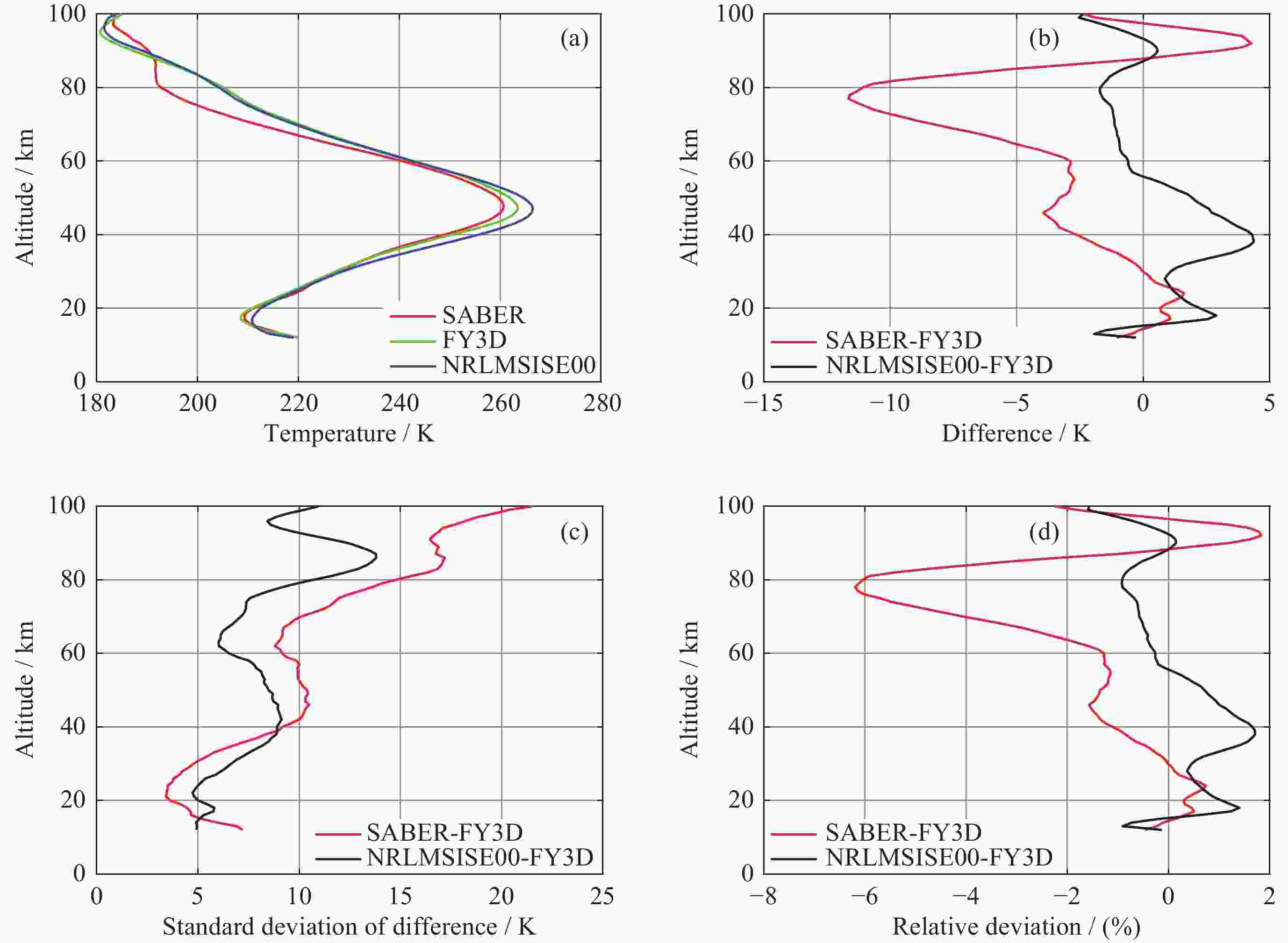Abstract: The accurate detection of atmospheric temperature is of great significance for studying the structural characteristics and dynamic processes of the middle and upper atmosphere. The GNOS (Global Navigation Satellite System Occultation Sounder) mounted on the FY3D has been carrying out atmospheric sounding since 15 November 2017. The purpose of this study is to evaluate the atmospheric temperature data products of the FY3D satellite. This study was conducted to comparatively analyze the atmospheric temperature data within the range of 12~100 km based on FY3D occultation observation data for 3 years from January 2019 to December 2021, with the aid of TIMED/SABER detection data and NRLMSISE00 atmospheric model data. The SABER-FY3D temperature deviation (TSABER–TFY3D) and NRLMSISE00-FY3D temperature deviation (TNRLMSISE00–TFY3D) and their distribution with latitude, season, and the difference between the northern and southern hemispheres were analyzed. The results show that the three sets of temperature data have generally consistent trend with change in height. SABER-FY3D temperature deviation is positive (0~1.8 K) in the altitude range of 12~30 km, and as the altitude increases, the temperature deviation increases from 0 K at 30 km to $ - $11.6 K at 77 km. NRLMSISE00-FY3D temperature deviation is positive (0~4.4 K) in the stratosphere, and negative ($ - $2~0 K) in the mesosphere and low thermosphere. Both temperature deviations show significant variations with latitude and season. Below 60 km, SABER-FY3D temperature deviation is smaller in the low-latitude region ($ - $3.8~1.8 K) and larger in the high-latitude region ($ - $12~1.6 K), smaller in summer ($ - $0.5~2.2 K) and larger in winter ($ - $6.2~1 K); NRLMSISE00-FY3D temperature deviation is just the opposite, smaller in the high-latitude region ($ - $1.6~2.4 K) and larger in the low-latitude ($ - $3.9~6.1 K), smaller in winter ($ - $2~2.2 K),, and larger in summer($ - $1.3~7.1 K). The zero deviation lines of the two types of monthly average temperature deviations show characteristics of being higher in spring and summer and lower autumn and winter in both hemispheres. In the winter, in the altitude region of 40~60 km, the negative deviation of the SABER-FY3D average temperature in the northern hemisphere is more obvious than that in the southern hemisphere. -
