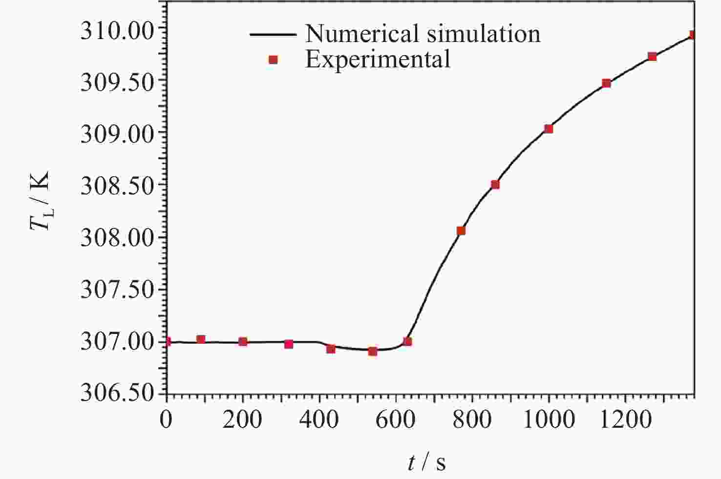 Figure  5.  Comparison between simulated results and experimental results of temperature of the liquid zone near the heating zone in NASA’s normal temperature fluid PnP tank during self-pressurization