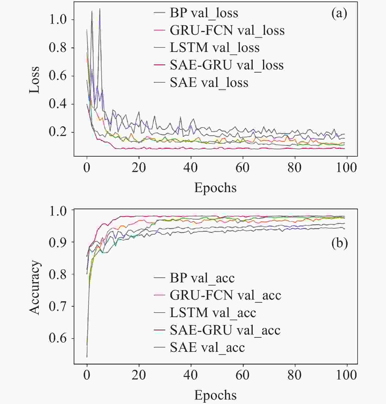 模型 训练损失 训练准确率/(%) SAE-GRU 0.0882 97.80 GRU-FCN 0.1843 94.72 LSTM 0.1775 95.34 BP 0.2342 88.89 SAE 0.2121 90.89 -