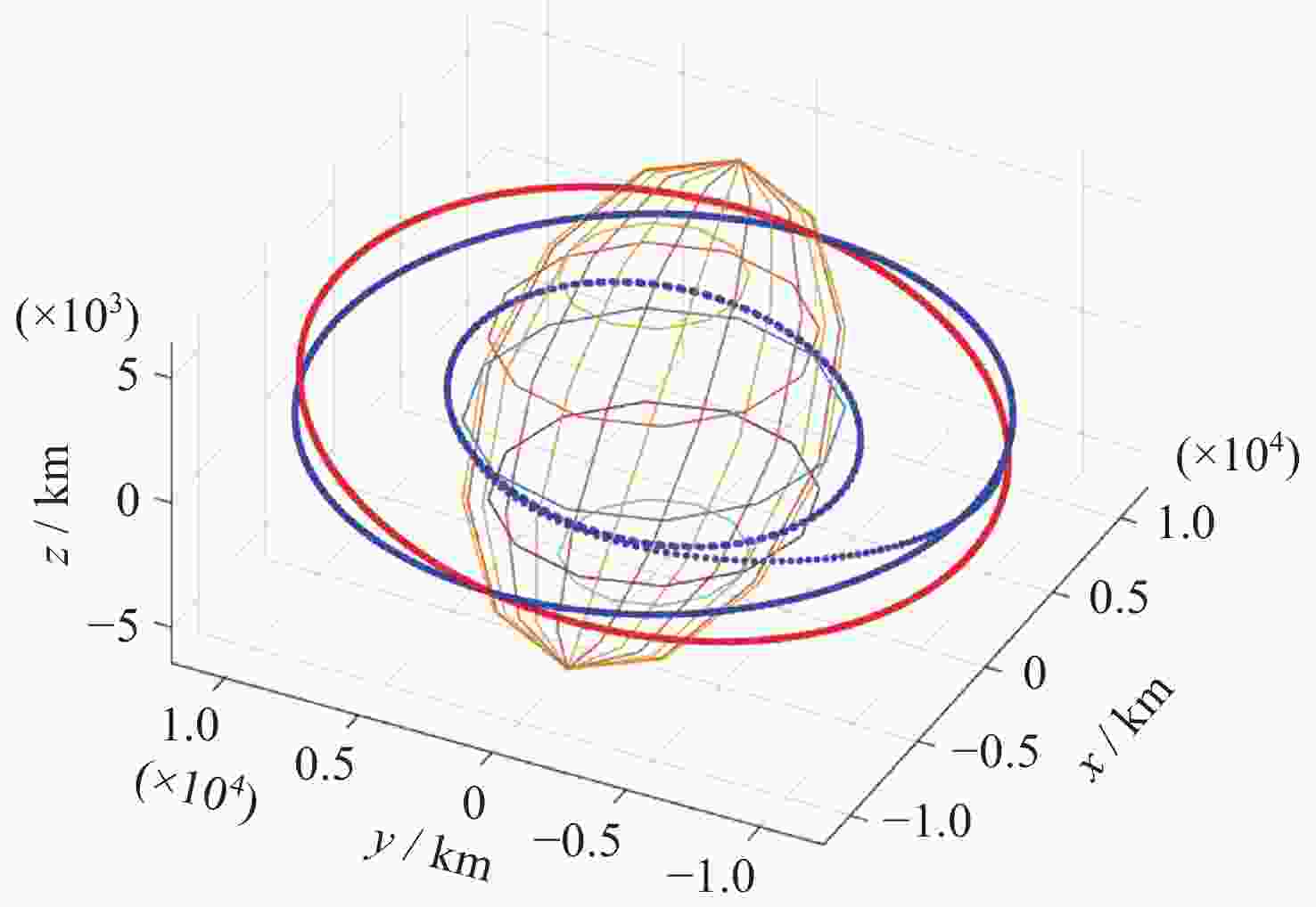 轨道根数 目标卫星 非合作目标卫星 绕飞轨道根数 转移轨道根数 半长轴a/km 12000.5667 7000.0789 12000 9182.77 偏心率e 0 0 0 0.360 轨道倾角i/(°) 10 10 0.175 7.436 升交点赤经Ω/(°) 0 0 3.126 101.496 近地点幅角ω/(°) 235 235 321.858 339.325 平近点角M/(°) 0 0 3.142 33.034 表 3 轨道保持意图目标星与非合作目标星轨道根数